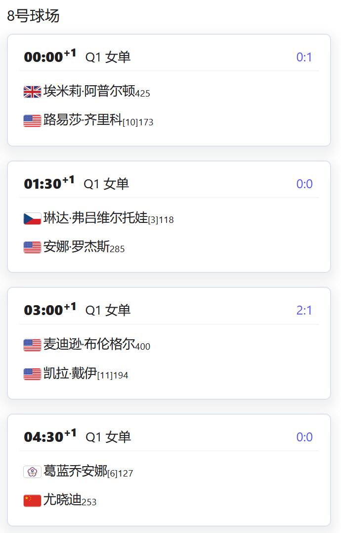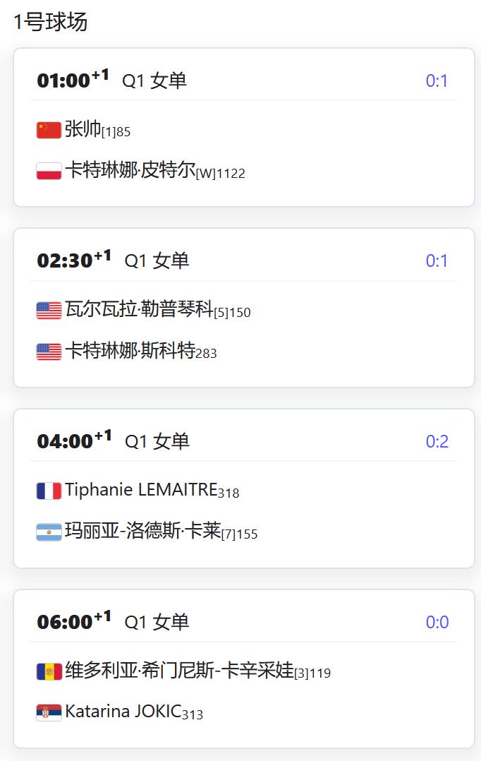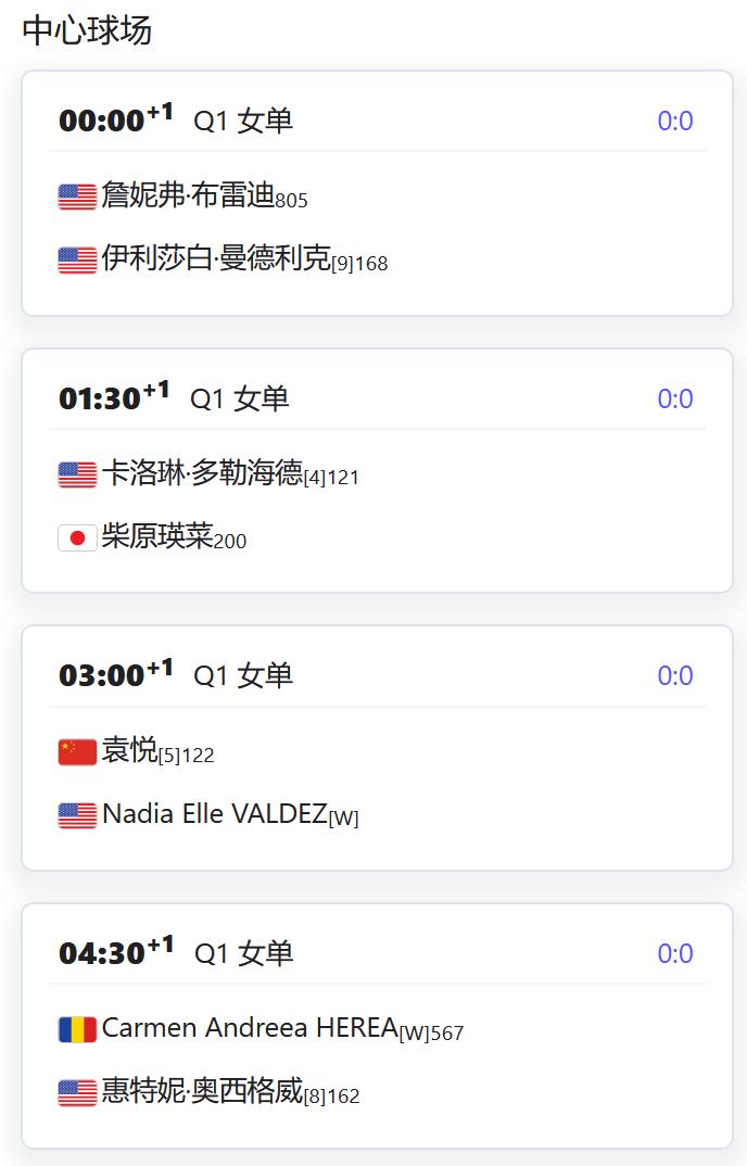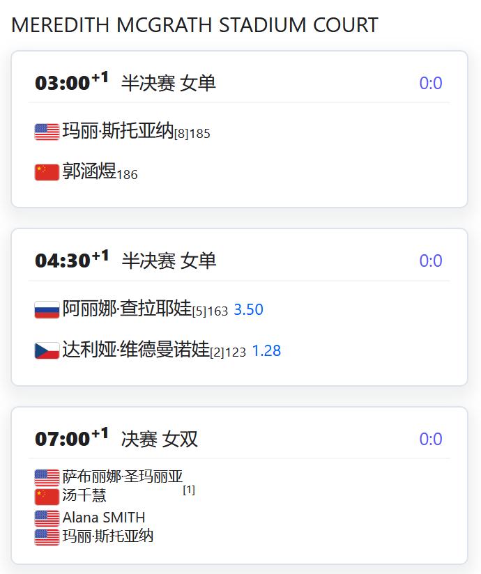 ATP500赛阿卡普尔科站,男单资格赛第一轮,吴易昺将对阵菲科维奇; WTA500赛梅里达站,女单资格赛第一轮,张帅以头号种子出战,对阵外卡球员皮特尔; 郭涵煜将对阵意大利的TONA; WTA250赛奥斯汀站,女单资格赛第一轮,前赛会冠军袁悦以5号种子出战,对阵本土外卡球员; 尤晓迪将对阵中国台湾的葛兰乔安娜; WTA125米德兰,女单半决赛郭涵煜将对阵8号种子斯托亚纳,由于赛程,郭涵煜很可能退掉奥斯汀站女单资格赛; 女双决赛,汤千慧/圣玛利亚将对阵史密斯/斯托亚纳。