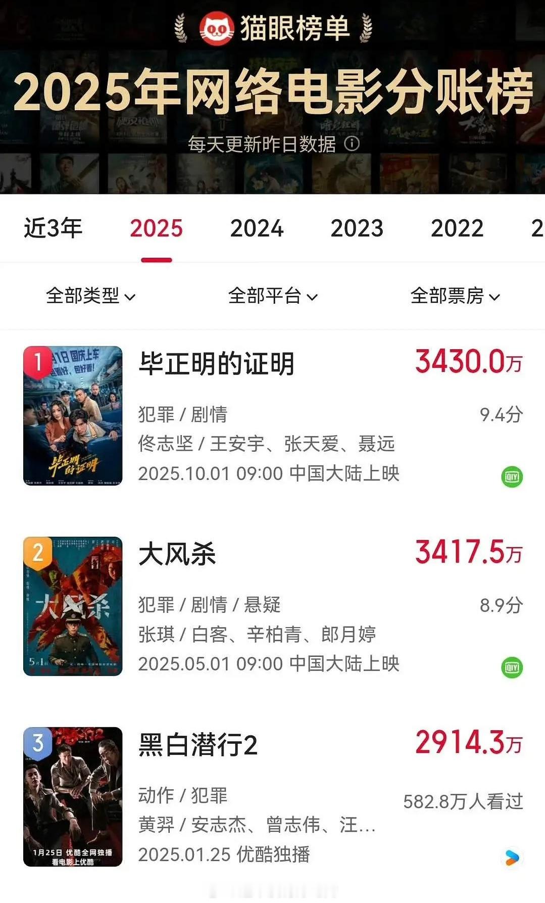 再看一遍王安宇《毕正明的证明》实绩院线票房8500万,网播分账票房3430(2025年网播分账冠军),综合票房已超过1亿。