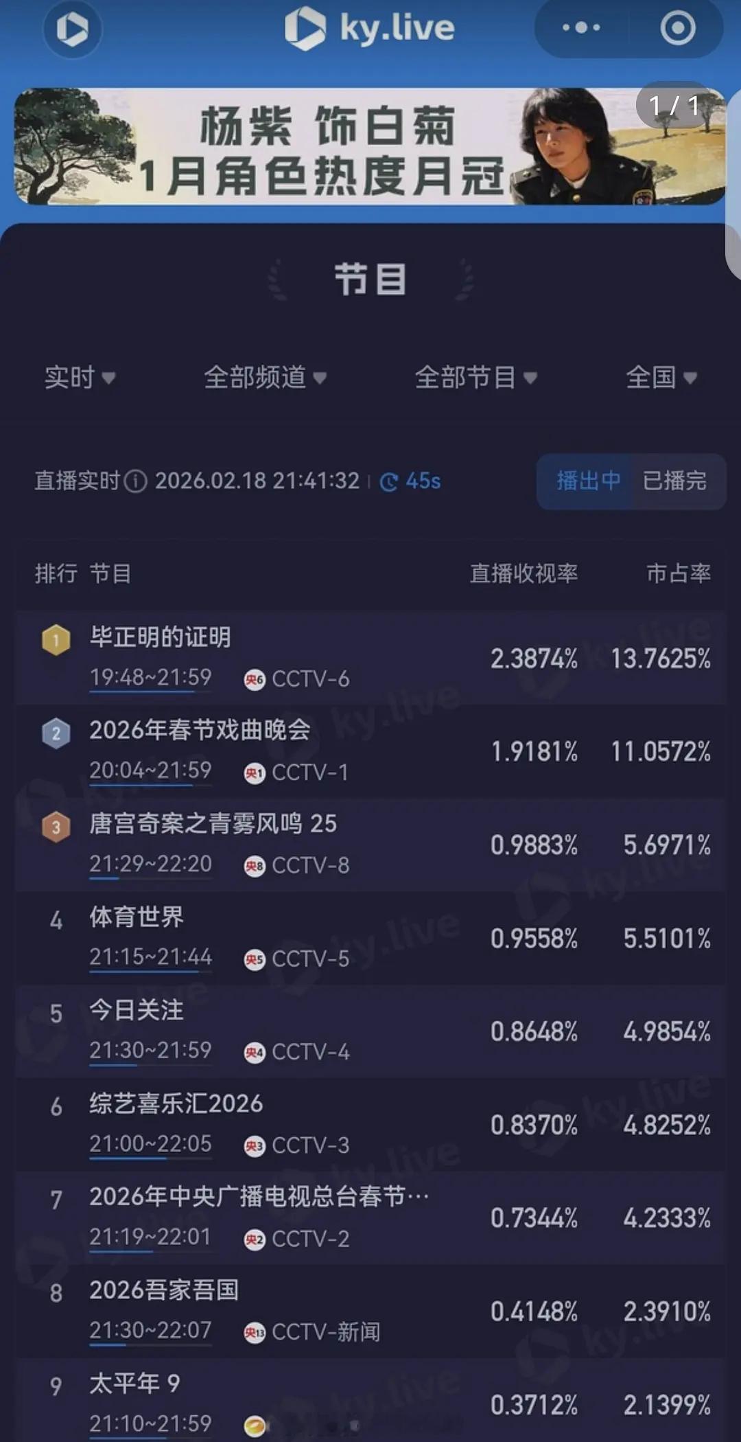 前几日六公主播了毕正明的证明,也是收视率实时冠军。