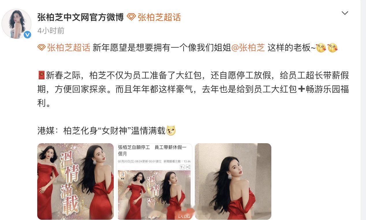 张柏芝让员工带薪休假一个月张柏芝给员工发超大红包 据港媒,张柏芝今年宠员工超大手笔!不仅派发超大红包,还直接停工,让员工带薪休一个月长假安心过年,妥妥的 “女财神” 本神,也太让人羡慕了吧