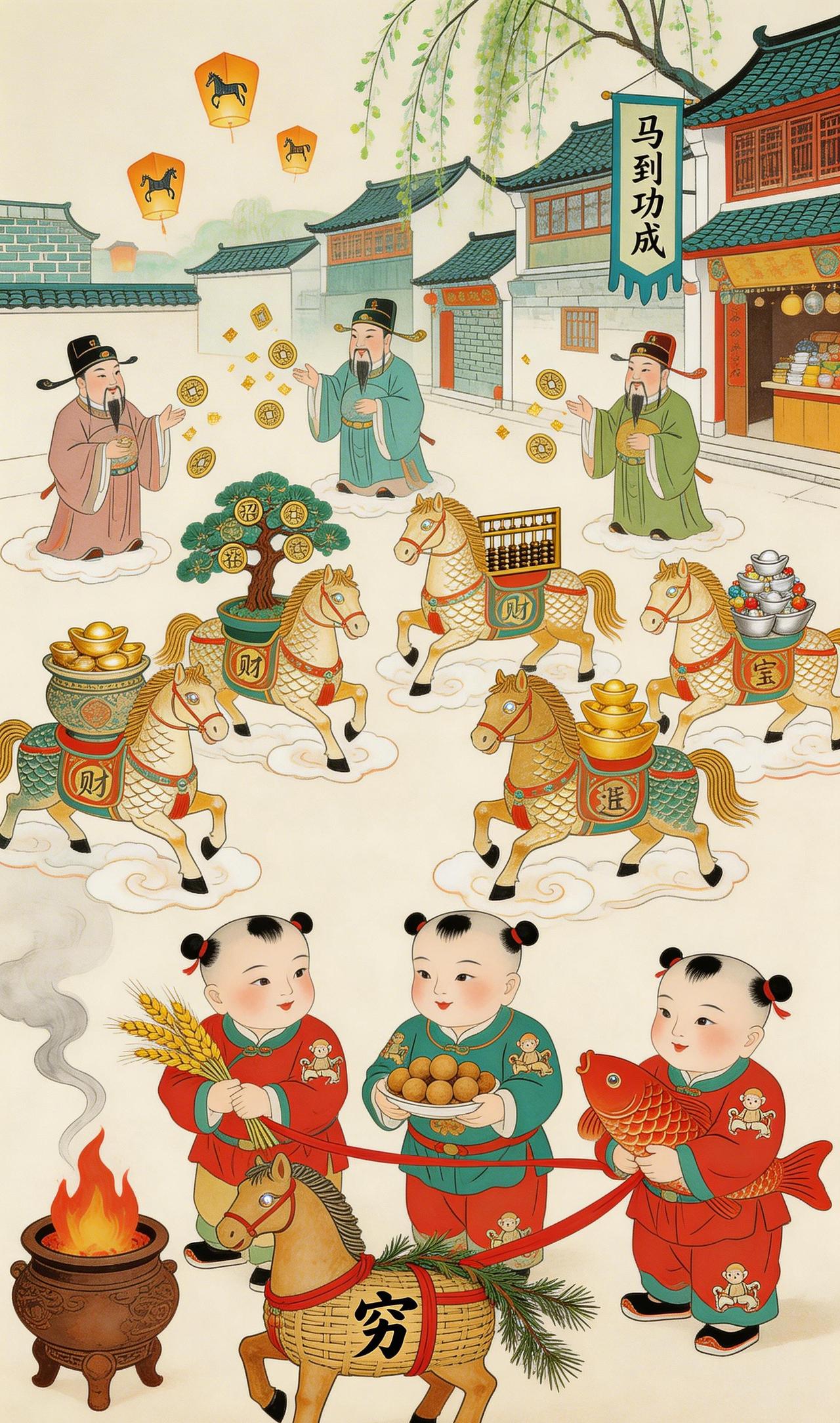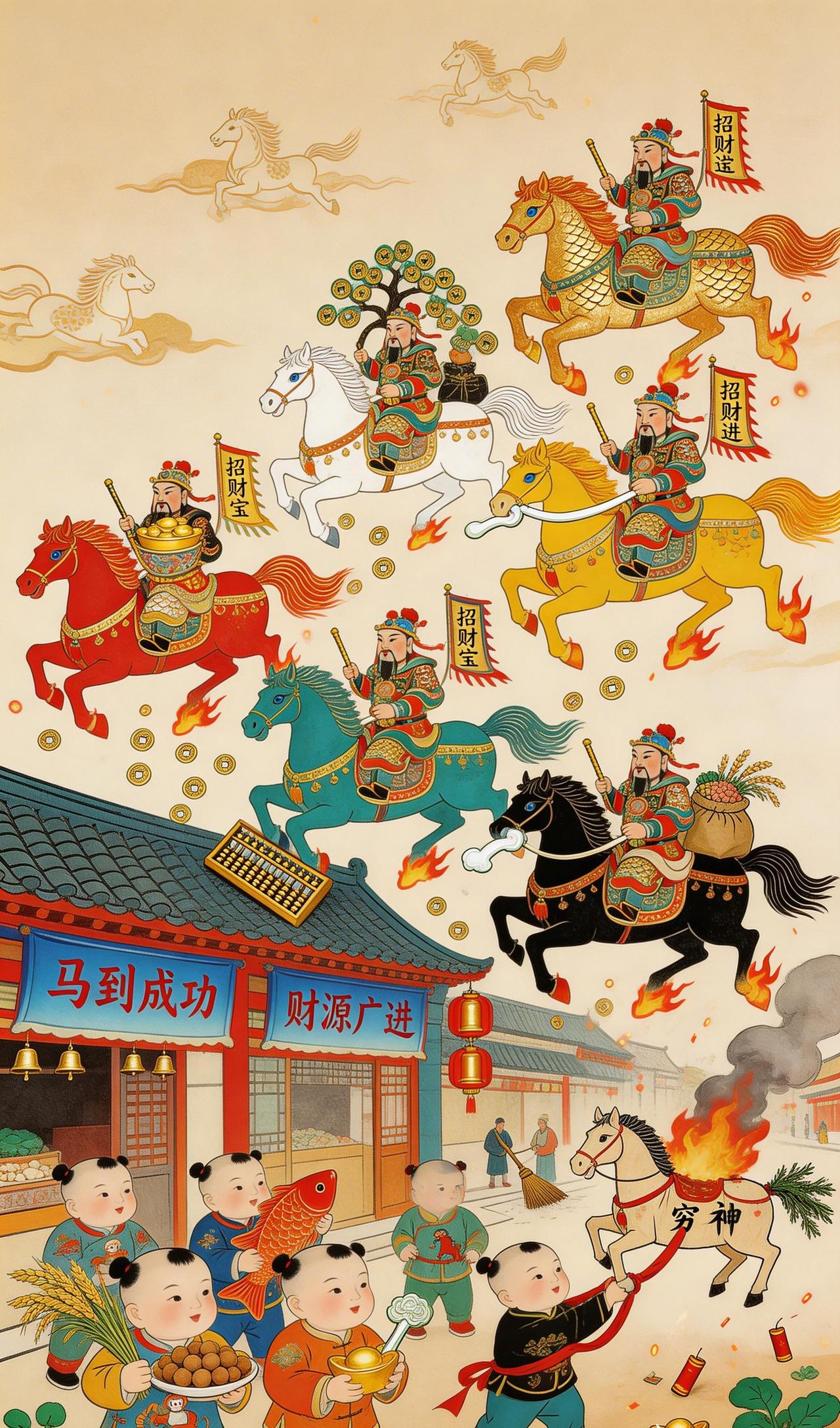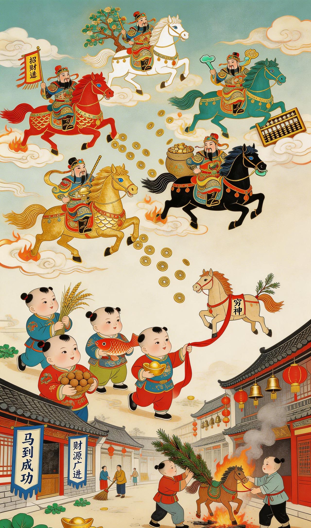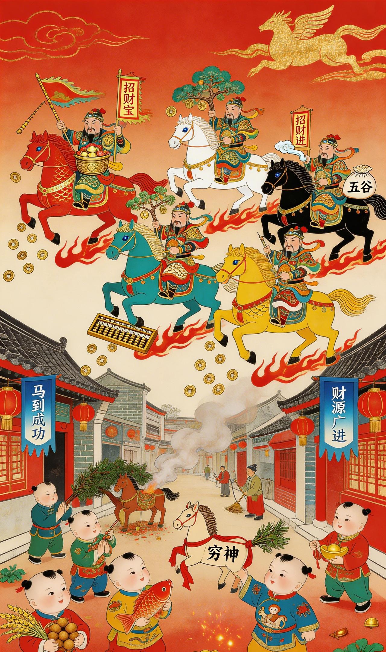 马年迎财神,五路送福来 初五晨光里,五匹鬃毛鎏金的龙马踏云而来。红鬃马驮着聚宝盆,盆中金银闪烁;白鬃马载着摇钱树,枝头铜钱叮当;青鬃马踏着金算盘,珠子噼啪作响;黄鬃马衔着玉如意,温润生辉;黑鬃马负着五谷袋,稻香四溢。五路财神端坐马背,手持金鞭与“招财进宝”幡旗,正向下方的福娃们撒落漫天铜钱。 长街青砖黛瓦,商铺幌子上写着“马到成功”“财源广进”。六个梳着马鬃发型的胖娃娃,有的捧着金黄稻穗,有的托着圆润桂圆,有的抱着红鲤,其中最调皮的娃娃用红绸系住一个纸扎的“穷马”,高高抛向空中。伙计们正将柏枝扎成的“穷马”抬出店铺,准备焚烧送走穷气。 檐下马铃铛灯笼随风轻响,地上散落着马齿苋与马蹄金。远处百姓手持扫帚清扫街巷,把贫穷与晦气一并扫出门外。天际祥云缭绕,天马行空,把财富与好运洒向人间。 这一幅《龙马送财》年画里,有马年的奔腾,有初五的希冀,更有中国人心中那份对美好生活的朴素期盼——送走穷气,迎来富贵,马到成功,财源滚滚。 中国传统年画 初五迎财神