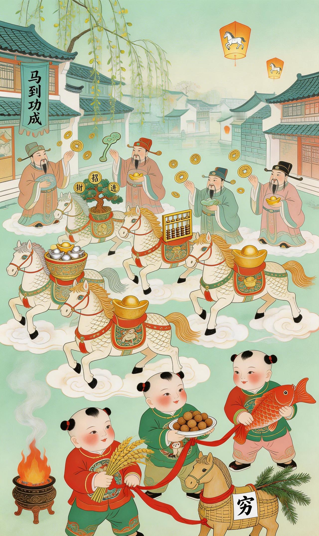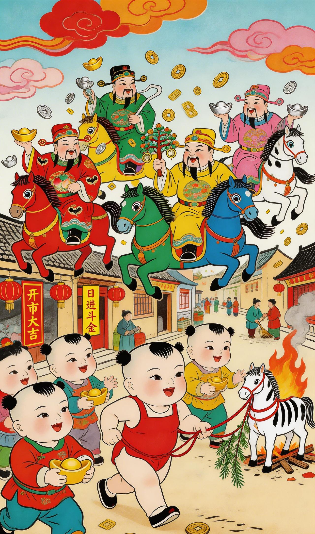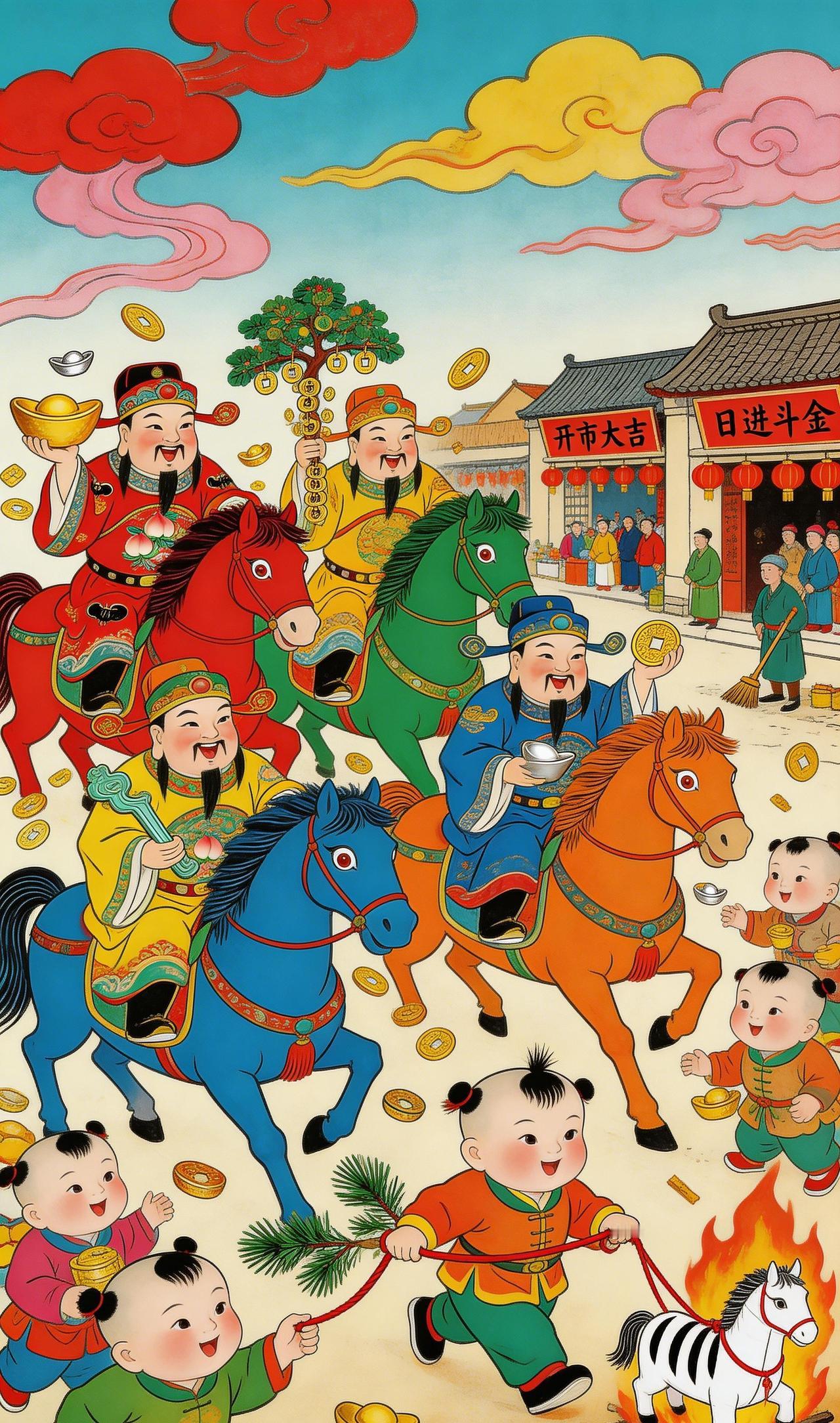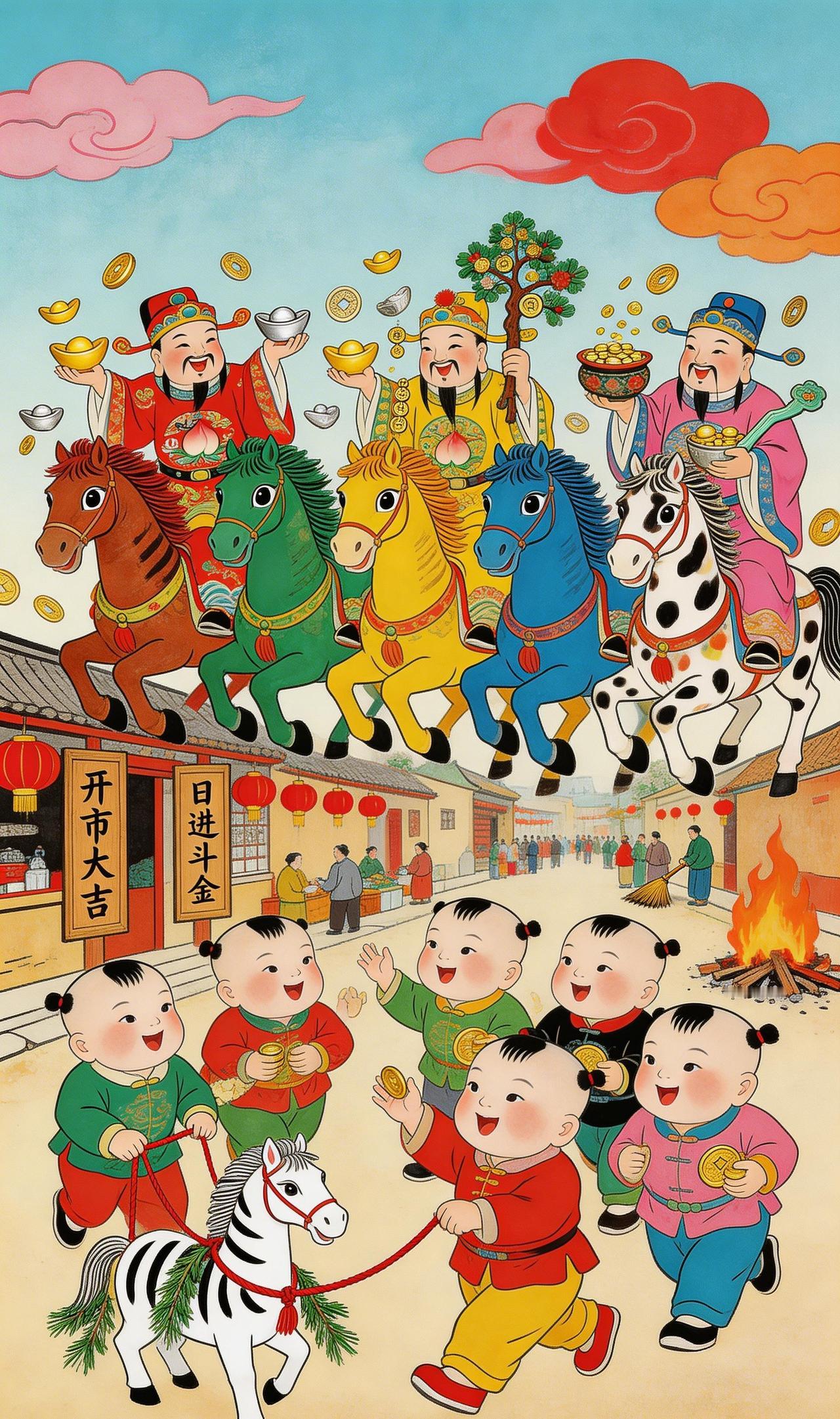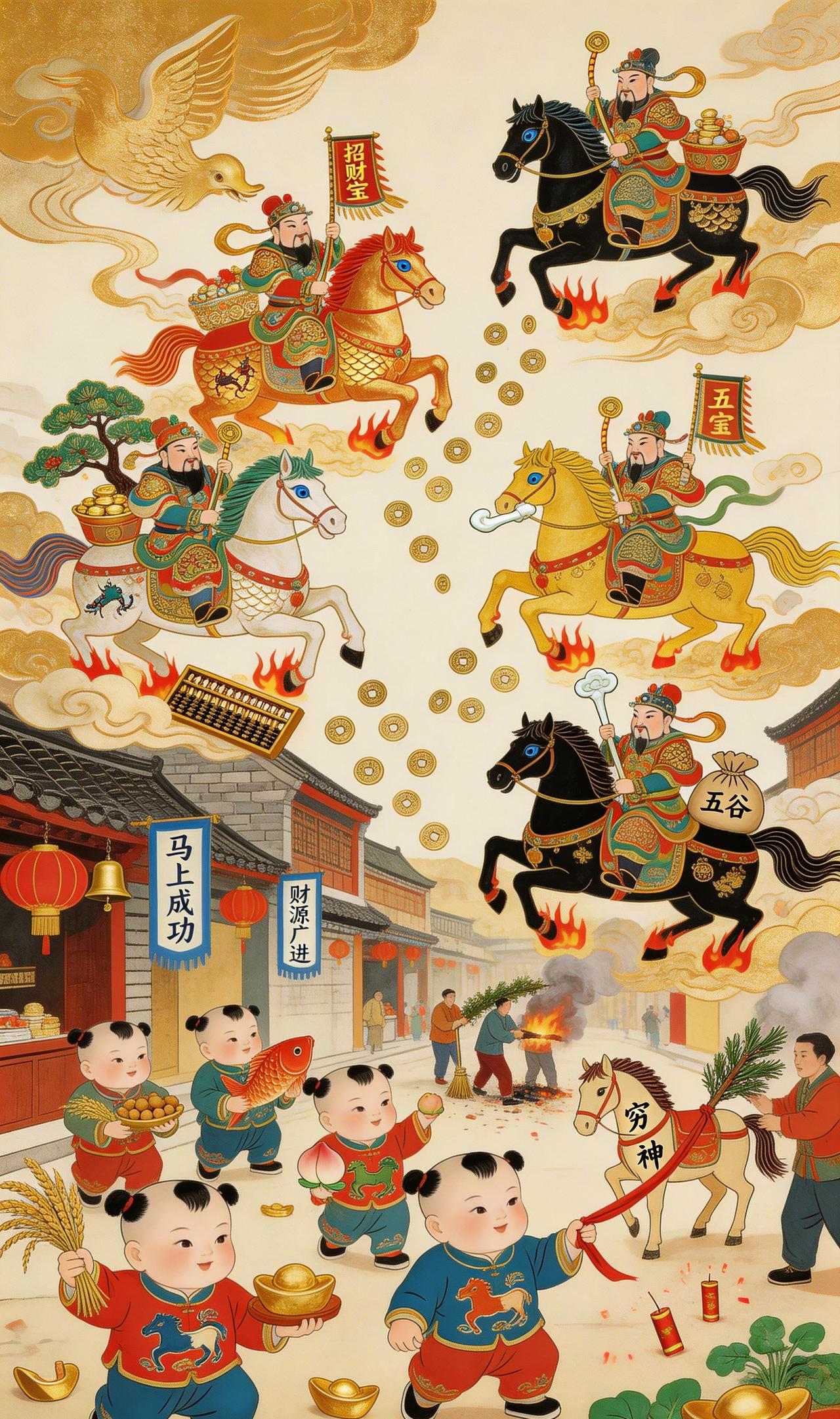 马年迎财神,五路送福来 初五晨光里,五匹鬃毛鎏金的龙马踏云而来。红鬃马驮着聚宝盆,盆中金银闪烁;白鬃马载着摇钱树,枝头铜钱叮当;青鬃马踏着金算盘,珠子噼啪作响;黄鬃马衔着玉如意,温润生辉;黑鬃马负着五谷袋,稻香四溢。五路财神端坐马背,手持金鞭与“招财进宝”幡旗,正向下方的福娃们撒落漫天铜钱。 长街青砖黛瓦,商铺幌子上写着“马到成功”“财源广进”。六个梳着马鬃发型的胖娃娃,有的捧着金黄稻穗,有的托着圆润桂圆,有的抱着红鲤,其中最调皮的娃娃用红绸系住一个纸扎的“穷马”,高高抛向空中。伙计们正将柏枝扎成的“穷马”抬出店铺,准备焚烧送走穷气。 檐下马铃铛灯笼随风轻响,地上散落着马齿苋与马蹄金。远处百姓手持扫帚清扫街巷,把贫穷与晦气一并扫出门外。天际祥云缭绕,天马行空,把财富与好运洒向人间。 这一幅《龙马送财》年画里,有马年的奔腾,有初五的希冀,更有中国人心中那份对美好生活的朴素期盼——送走穷气,迎来富贵,马到成功,财源滚滚。 中国传统年画 初五迎财神
