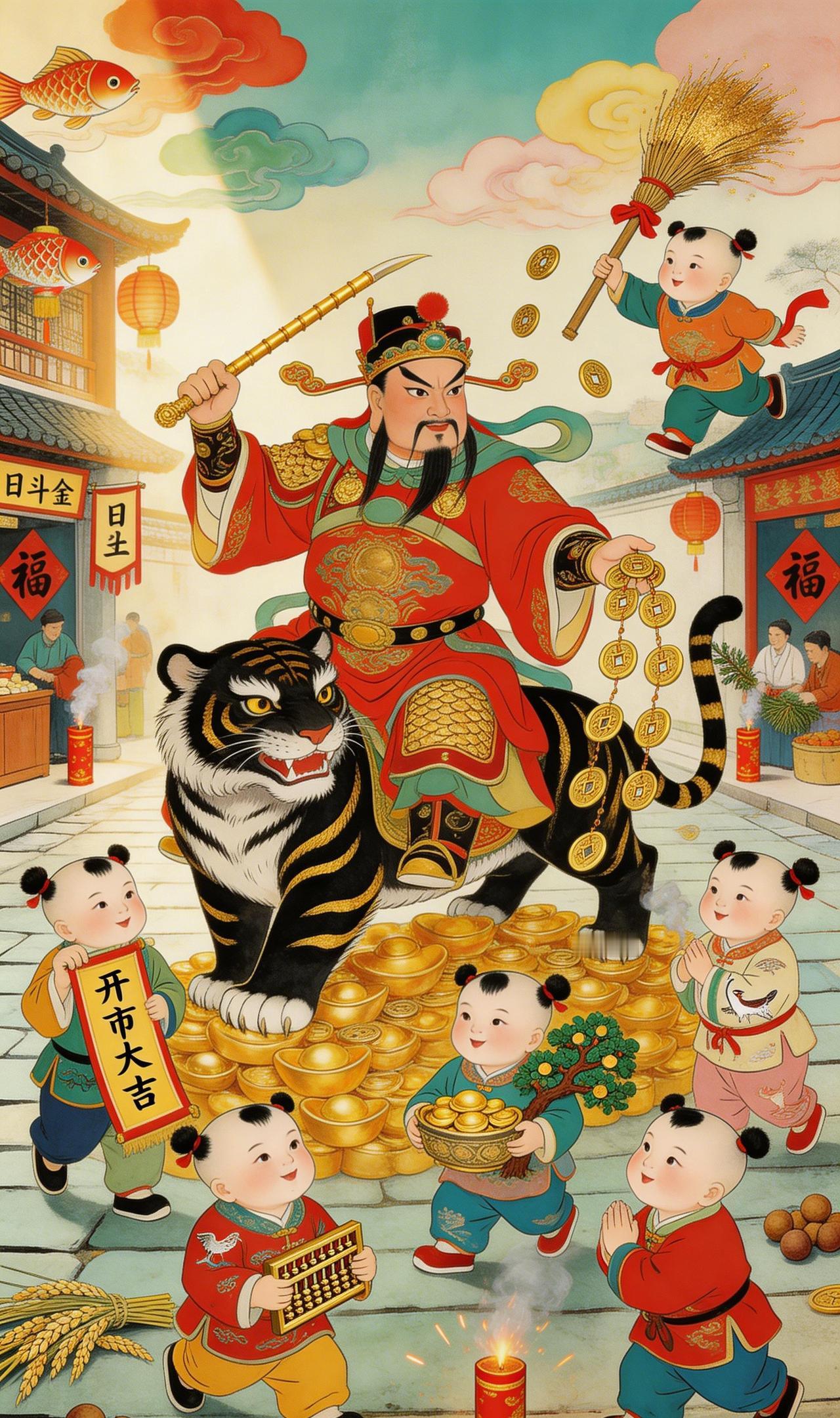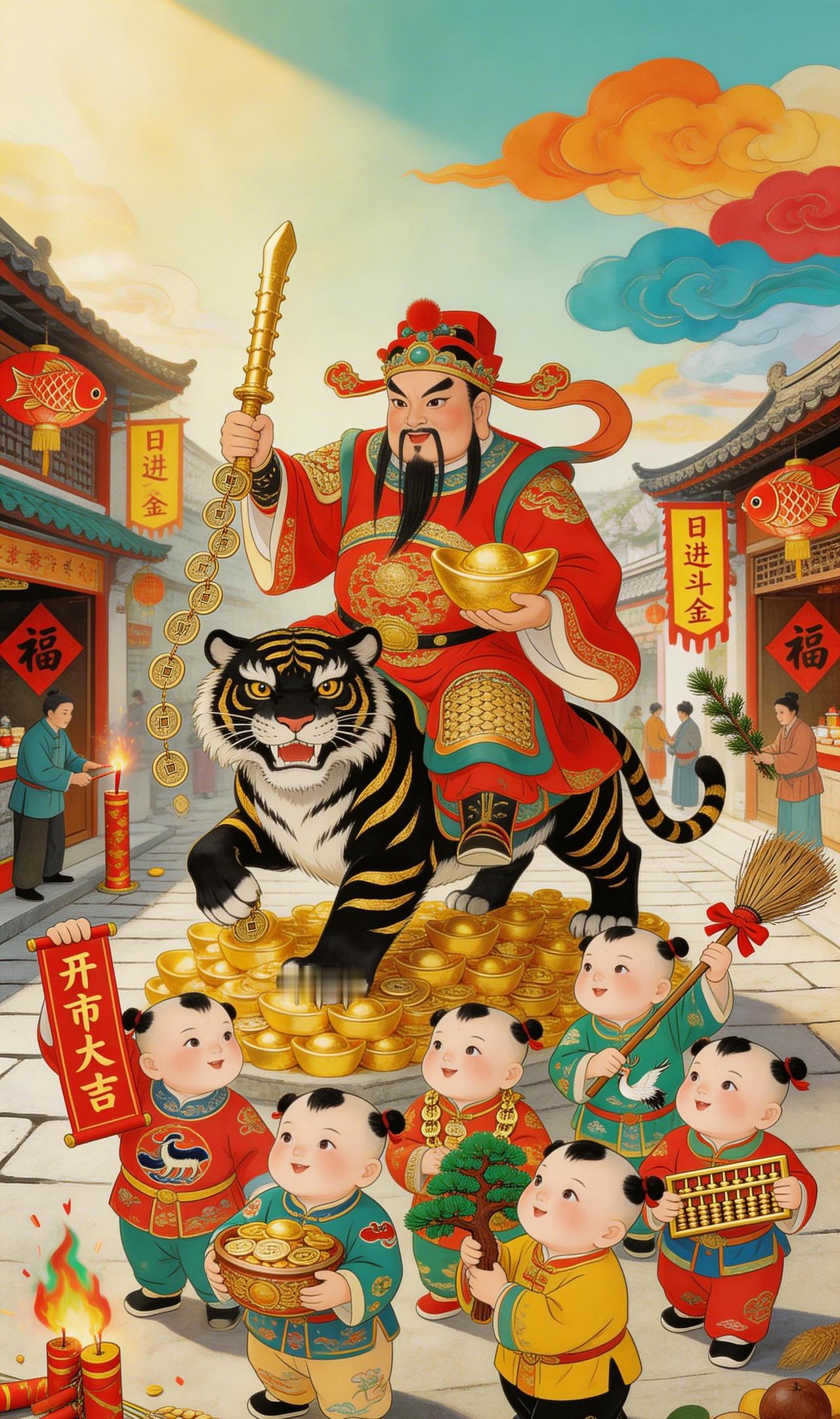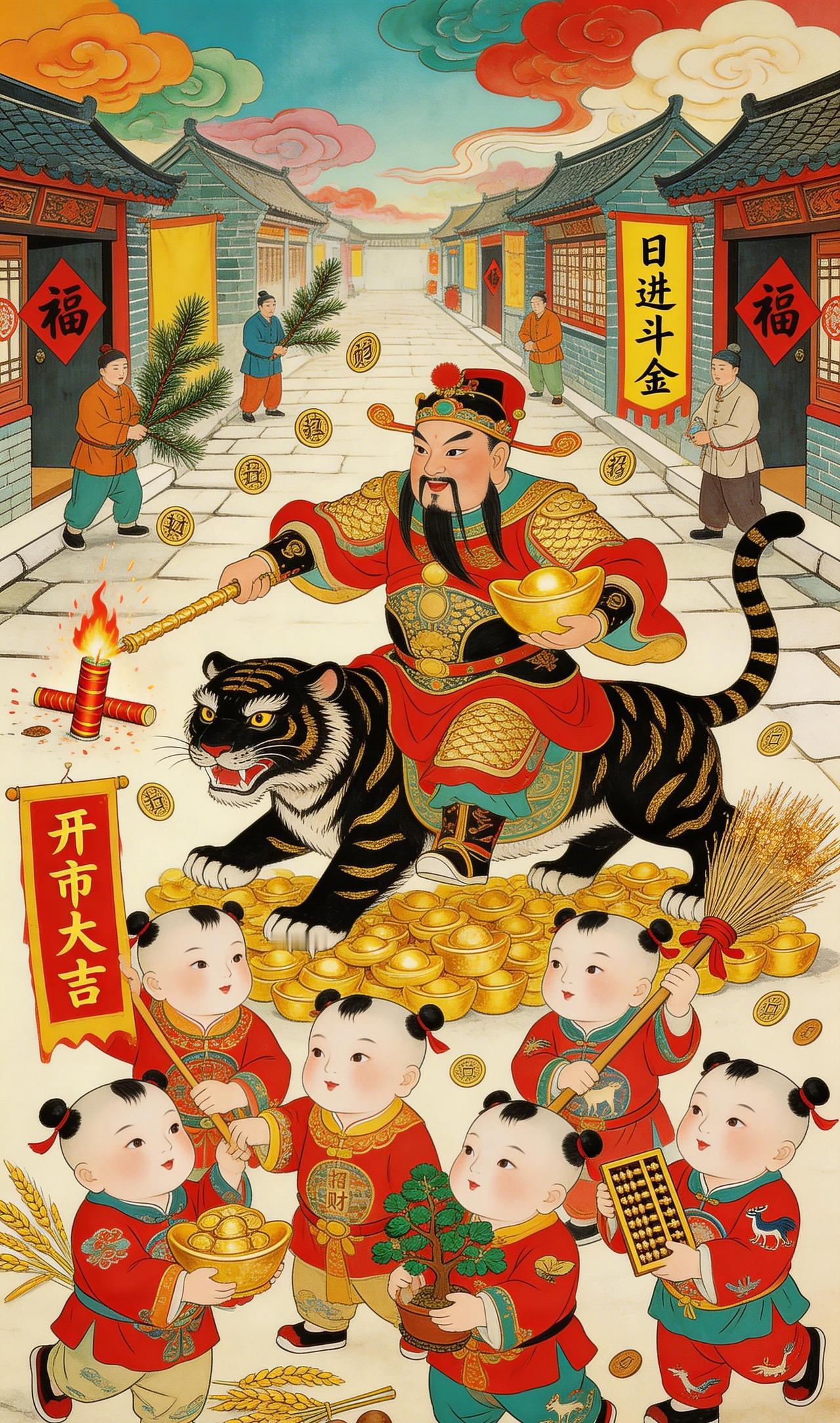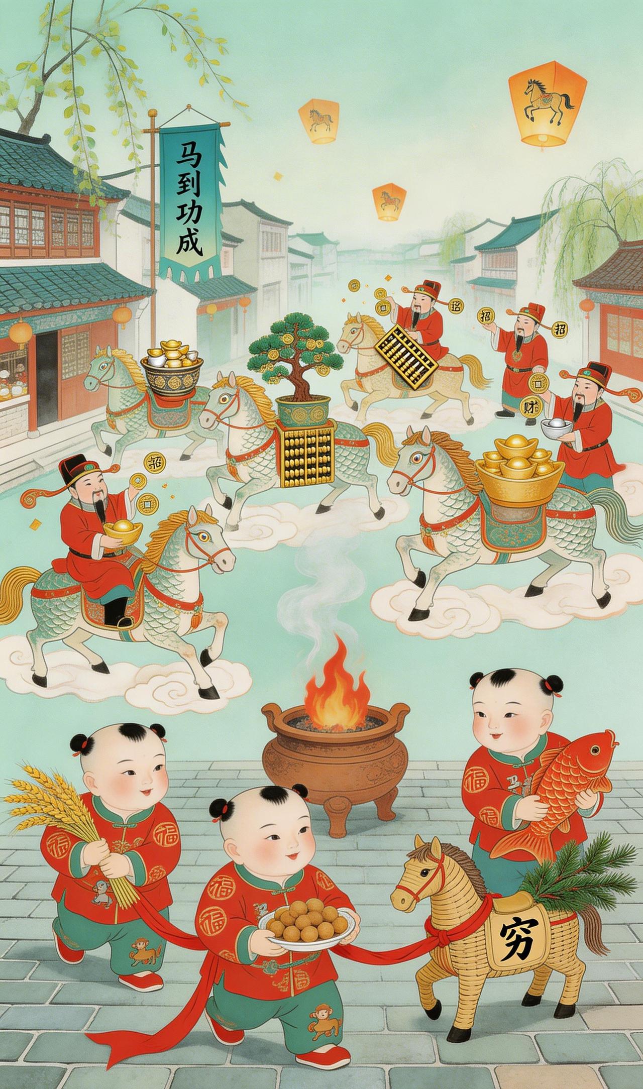 马年迎财神,五路送福来 初五晨光里,五匹鬃毛鎏金的龙马踏云而来。红鬃马驮着聚宝盆,盆中金银闪烁;白鬃马载着摇钱树,枝头铜钱叮当;青鬃马踏着金算盘,珠子噼啪作响;黄鬃马衔着玉如意,温润生辉;黑鬃马负着五谷袋,稻香四溢。五路财神端坐马背,手持金鞭与“招财进宝”幡旗,正向下方的福娃们撒落漫天铜钱。 长街青砖黛瓦,商铺幌子上写着“马到成功”“财源广进”。六个梳着马鬃发型的胖娃娃,有的捧着金黄稻穗,有的托着圆润桂圆,有的抱着红鲤,其中最调皮的娃娃用红绸系住一个纸扎的“穷马”,高高抛向空中。伙计们正将柏枝扎成的“穷马”抬出店铺,准备焚烧送走穷气。 檐下马铃铛灯笼随风轻响,地上散落着马齿苋与马蹄金。远处百姓手持扫帚清扫街巷,把贫穷与晦气一并扫出门外。天际祥云缭绕,天马行空,把财富与好运洒向人间。 这一幅《龙马送财》年画里,有马年的奔腾,有初五的希冀,更有中国人心中那份对美好生活的朴素期盼——送走穷气,迎来富贵,马到成功,财源滚滚。 中国传统年画 初五迎财神