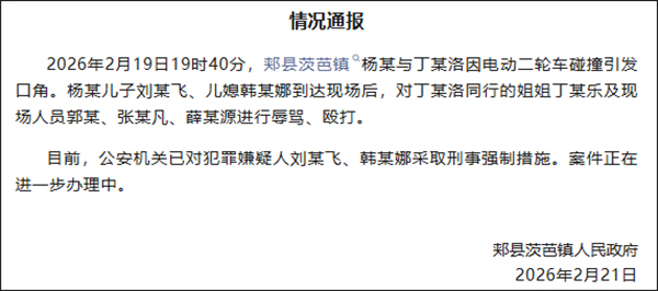 据河南省平顶山市郏县微信公众号“郏县融媒”消息,郏县茨芭镇人民政府2月21日发布情况通报称,2月19日19时40分,郏县茨芭镇杨某与丁某洛因电动二轮车碰撞引发口角。杨某儿子刘某飞、儿媳韩某娜到达现场后,对丁某洛同行的姐姐丁某乐及现场人员郭某、张某凡、薛某源进行辱骂、殴打。