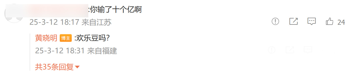 2025年3月,“黄晓明在线辟谣输了十个亿”话题登上热搜。当时,黄晓明在微博晒出多张日落风景图,并在该微博评论区回应了相关质疑。