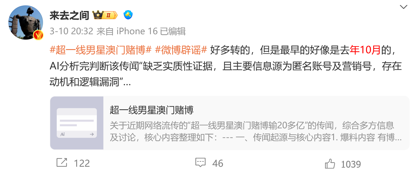 微博首席执行官王高飞@来去之间发文表示:好多转的,但是最早的好像是去年(2024年)10月的,AI分析完判断该传闻“缺乏实质性证据,且主要信息源为匿名账号及营销号,存在动机和逻辑漏洞”。