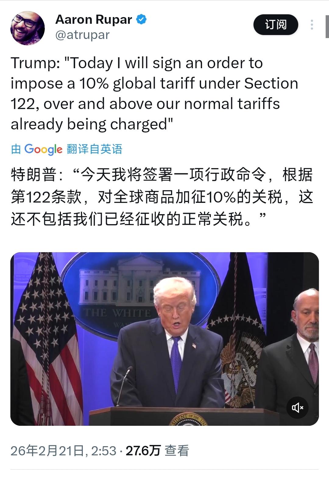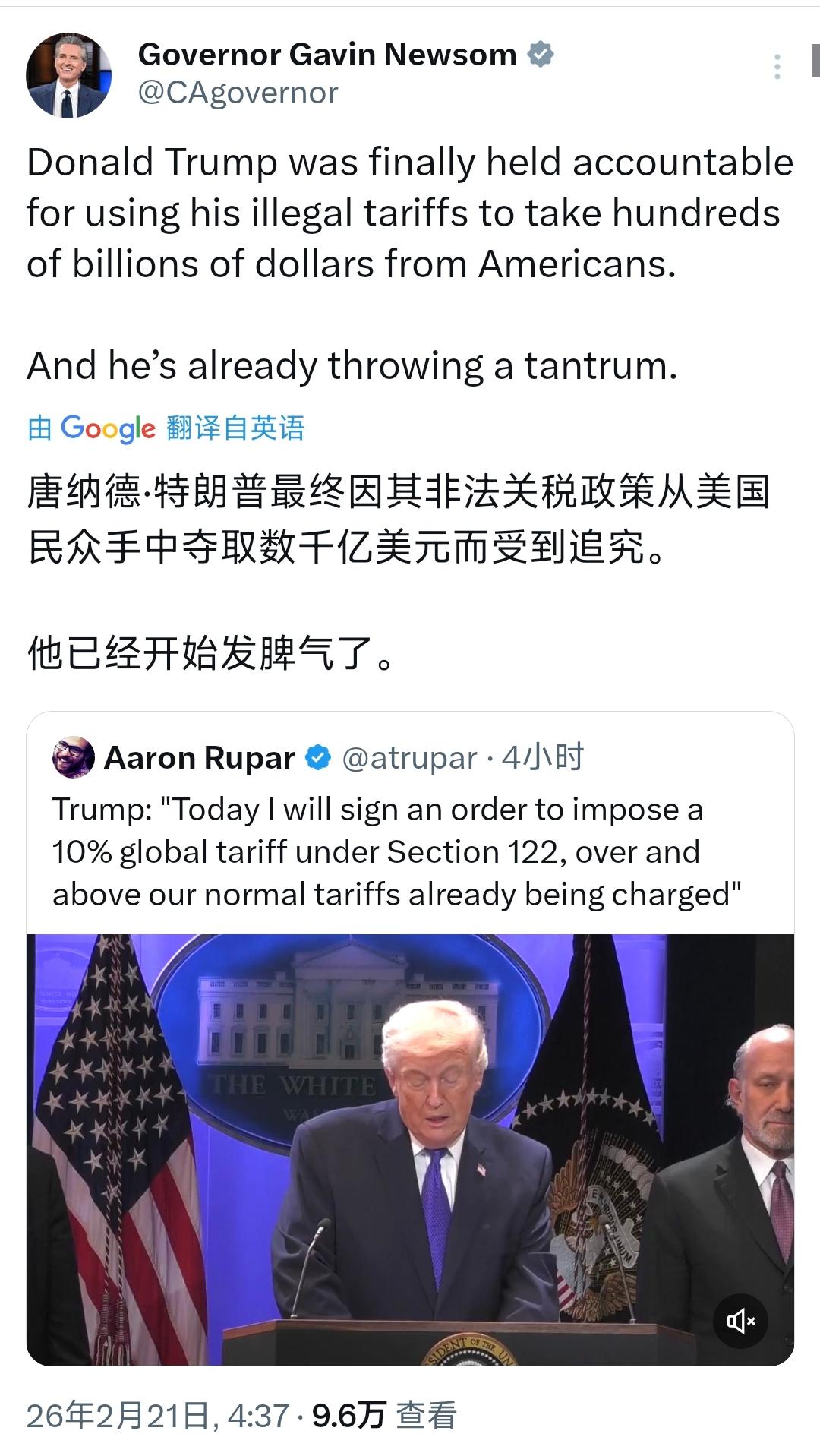 加州州长纽森(北京时间2月21日)发文写道:“唐纳德·特朗普最终因其非法关税政策从美国民众手中夺取数千亿美元而受到追究。他已经开始发脾气了。” 纽森转发了新闻:“特朗普:‘今天我将签署一项行政命令,根据第122条款,对全球商品加征10%的关税,这还不包括我们已经征收的正常关税。’” 可能很多人看懵了,俩人这又是闹哪出?其实不是突发矛盾,是特朗普的关税政策刚被最高法院判了违法,急了眼才放狠话要加新关税,纽森不过是敢第一个站出来戳破他的人。 先把事儿捋明白,当地时间2月20日,美国最高法院刚出了裁决,认定特朗普之前靠《国际紧急经济权力法》搞的大规模关税,根本没有明确的法律授权,等于说那些关税从一开始就不合法。 这可不是小事,要知道特朗普2025年上台后,就靠这部法律绕开国会,直接下行政令加征关税,现在被最高法院泼了冷水,等于他最顺手的关税“捷径”被堵死了。 更头疼的是,这些非法关税收了这么久,美国企业已经开始准备起诉,要求政府退还缴的税款,金额可能高达数百亿美元,这对特朗普来说,里子面子都输光了。 也正因为这样,他才立马跳出来放话,要签新的行政命令,依据《1974年贸易法》第122条款,对全球商品再加征10%关税,还特意强调不包含已经征收的正常关税。 别被他唬住,这个第122条款根本不是长久之计,按照规定,靠这个条款加征的关税,最多只能维持150天,想延长还得找国会合作,说白了就是急着摆姿态,给自己找补面子。 纽森为啥敢直接硬刚?俩人的梁子早就结下了,不光是关税的事,更因为特朗普一直在拆加州的台。 就在几天前,加州刚起诉特朗普,指控他非法终止了加州氢能中心12亿美元的联邦拨款,差点让20多万个工作岗位泡汤。 而且特朗普一直打压清洁能源,大力扶持石油天然气,还退出了《巴黎协定》,但加州偏偏要搞环保、搞新能源,甚至绕开联邦政府,直接和英国签了清洁能源合作协议,俩人早就吵得不可开交。 纽森说特朗普“从美国民众手里抢钱”,一点都不夸张。很多人以为关税是外国企业掏钱,其实根本不是,哈佛大学的研究早就说了,特朗普关税的成本,几乎全是美国进口商承担。 进口商要么自己消化成本、压缩利润,要么就把这部分钱加到商品价格里,转嫁给美国老百姓。有分析显示,这已经让普通美国家庭每年多花1681美元,相当于硬生生从普通人兜里掏钱。 更讽刺的是,特朗普一直吹关税能保护美国制造业、增加就业,可事实恰恰相反。过去一年,美国工厂一直低迷,2025年还出现了大规模裁员,很多依赖外国零部件的工厂,都被关税拖得喘不过气。 这次特朗普急着加征新关税,说白了就是输不起,被最高法院判违法后,不想丢面子,就想靠新的强硬政策稳住支持者。 但他没算明白,150天的临时关税,根本解决不了问题,反而会让美国的通胀压力更大,老百姓买东西更贵。 纽森敢直接开撕,其实也有自己的底气。加州是美国经济第一大州,相当于全球第五大经济体,本身就有足够的实力和联邦政府叫板,而且他一直被视为2028年总统大选的热门人选,这次站出来怼特朗普,也是在给自己攒人气。 说到底,俩人的互撕,表面上是关税政策和能源政策的分歧,本质上还是美国内部的政治博弈。特朗普想靠强硬关税稳住自己的基本盘,纽森则想借着反特朗普的立场,争取更多支持。 但最倒霉的,还是美国的普通老百姓。不管俩人吵得多凶,最终买单的都是他们,关税加得越多,他们的生活成本就越高,工作机会也越不稳定。 后续就看特朗普的新关税能不能落地,国会会不会配合他延长,还有那些被非法关税坑了的企业,能不能成功要回退款。 至于纽森和特朗普的恩怨,估计还得吵上好一阵子,毕竟俩人的较量,才刚刚开始。