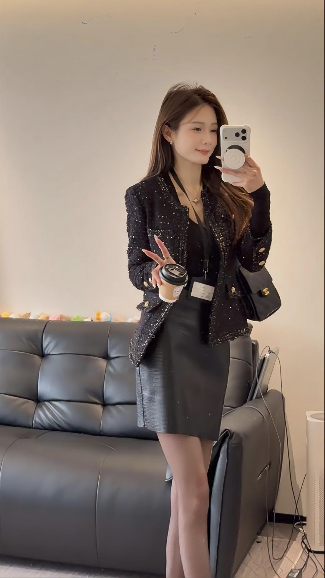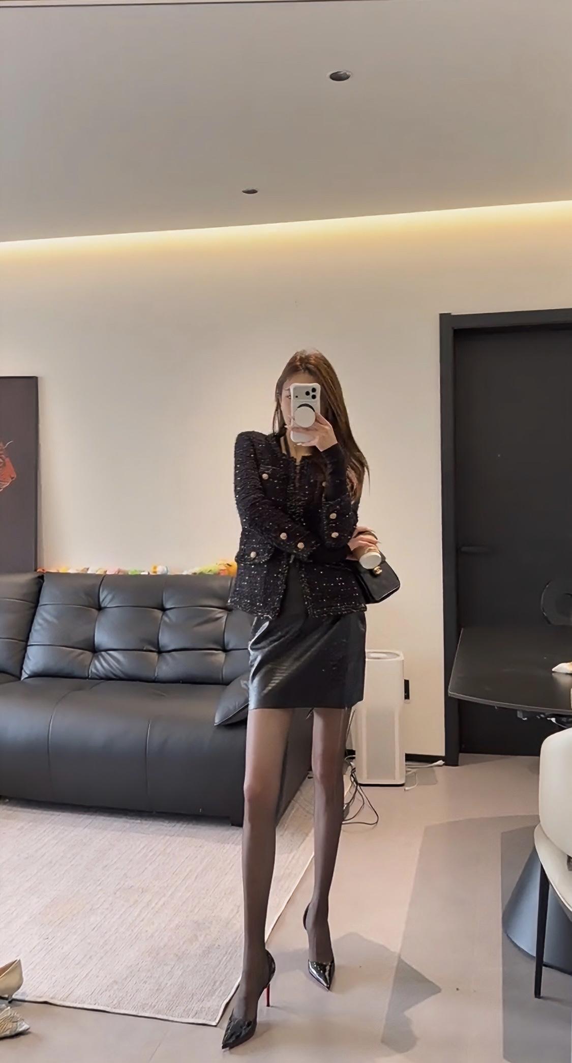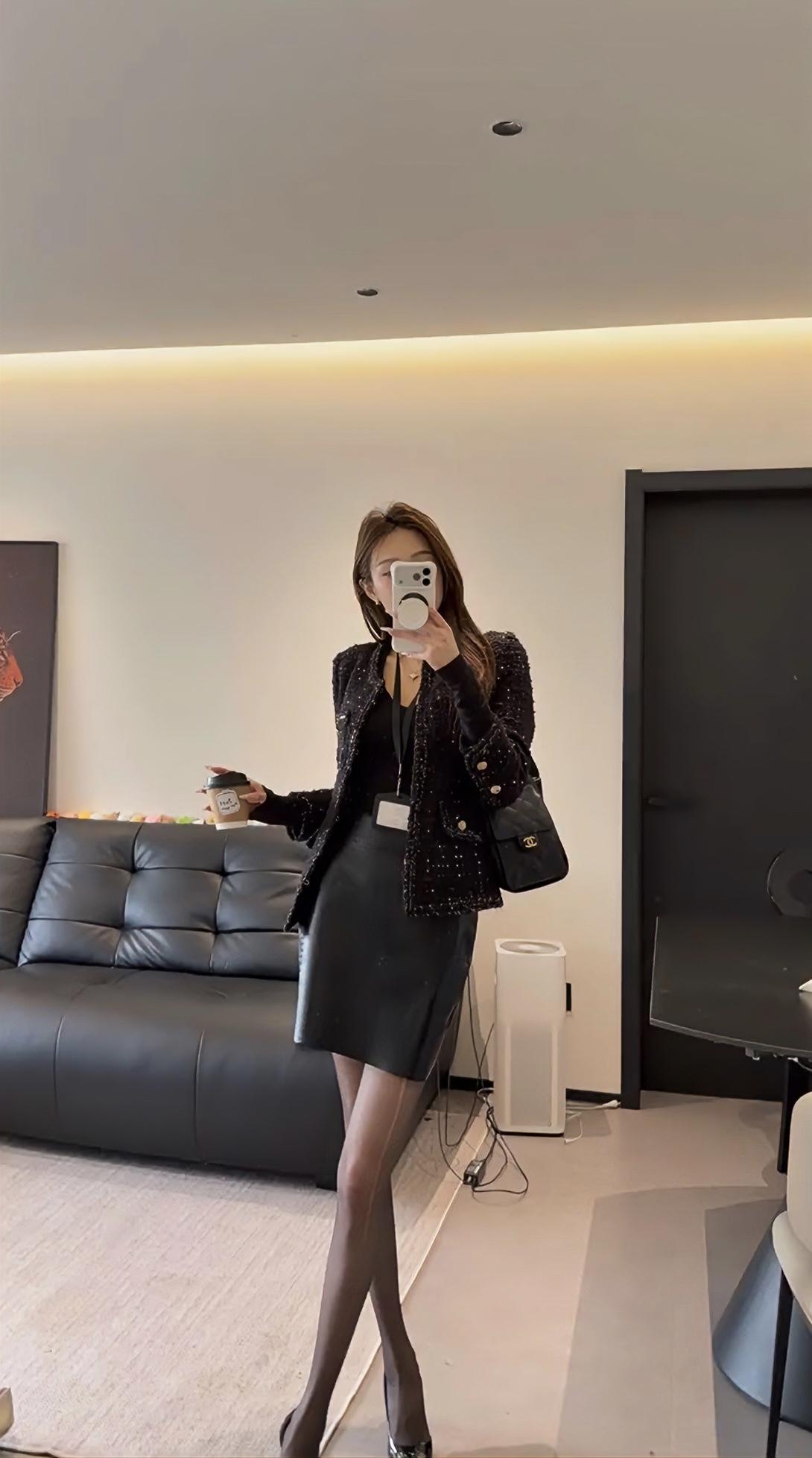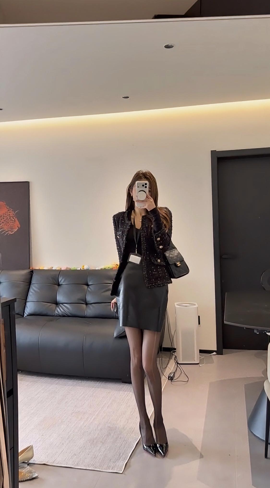 这套穿搭是典型的轻熟风通勤造型,兼具精致感与利落感: • 外套:黑色粗花呢小香风外套,带有亮片和金属扣点缀,自带名媛气质,同时粗花呢材质提升了质感与保暖度。 • 内搭:黑色修身针织衫,简约又能凸显身材线条,与外套形成层次。 • 下装:黑色皮质包臀短裙,利落又性感,中和了外套的甜腻,增添了酷感。 • 配饰:黑色菱格纹腋下包、细高跟尖头鞋,加上黑色打底裤,修饰腿型,让整体造型更显修长,风格统一且精致。 适合场合:这套穿搭的适配性很强,主要适合以下场景。 1. 职场通勤:小香风外套+皮裙的组合,既专业又不失女性魅力,适合办公室、商务会议等正式但不刻板的职场环境。 2. 轻商务会面:精致的质感和利落的剪裁,能在客户会面、项目洽谈等场合展现专业与自信。 3. 都市约会/下午茶:去掉工牌后,这套穿搭也很适合和朋友的精致约会、咖啡馆小聚,轻松拿捏氛围感。 4. 时尚活动/派对:亮片元素和皮质材质自带吸睛属性,稍加搭配就能成为派对中的焦点。