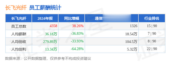 证券之星显示,2024年,长飞光线员工总数4358人,同比增38.26%;人均薪酬36.18万元,同比减36.83%;人均创收279.89万元,同比减33.93%;人均创利13.34万元,同比减64.28%。