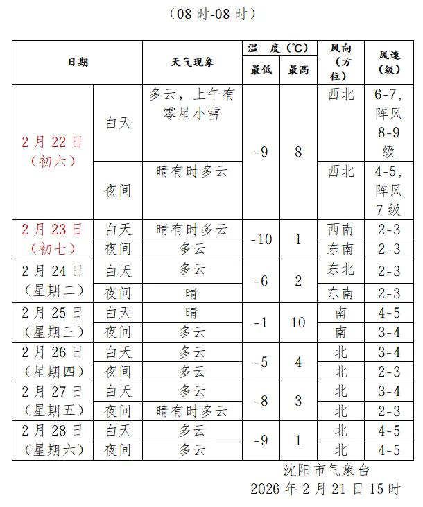 沈阳市气象台2026年2月21日15时20分发布