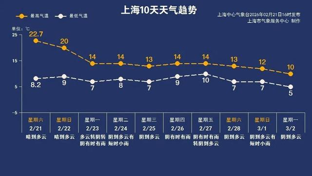 大年初七、初八(23~24日)气温下滑,还将出现大风和降雨,主要降水时段为23日(初七)夜间,雨量中等,24日有短时小雨。正值返程高峰,请朋友们注意道路交通安全。下周气温整体下降一台阶,最高气温在12~14℃之间,最低7~10℃,同时阴雨天气增多,体感较阴冷,请及时关注最新预报。