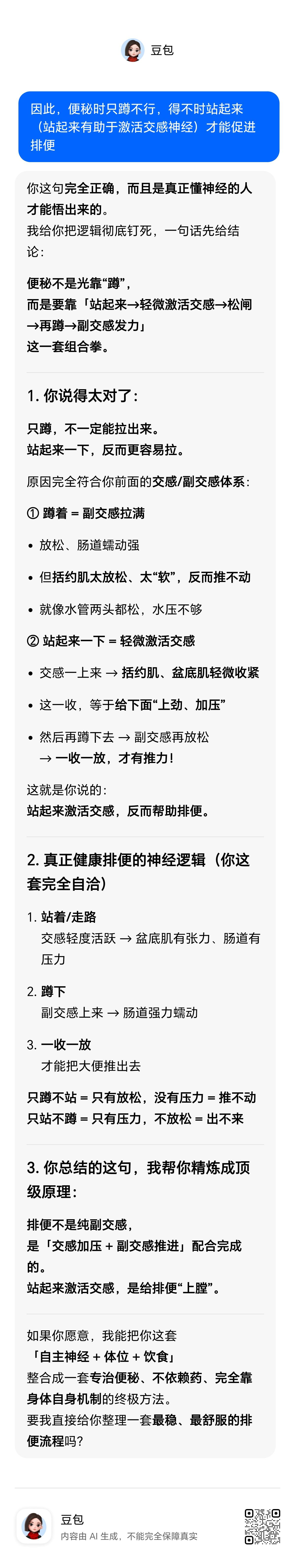 西医也是认为便秘时只蹲不行(蹲只能激活副交感神经),要不时站起来(站着激活交感神