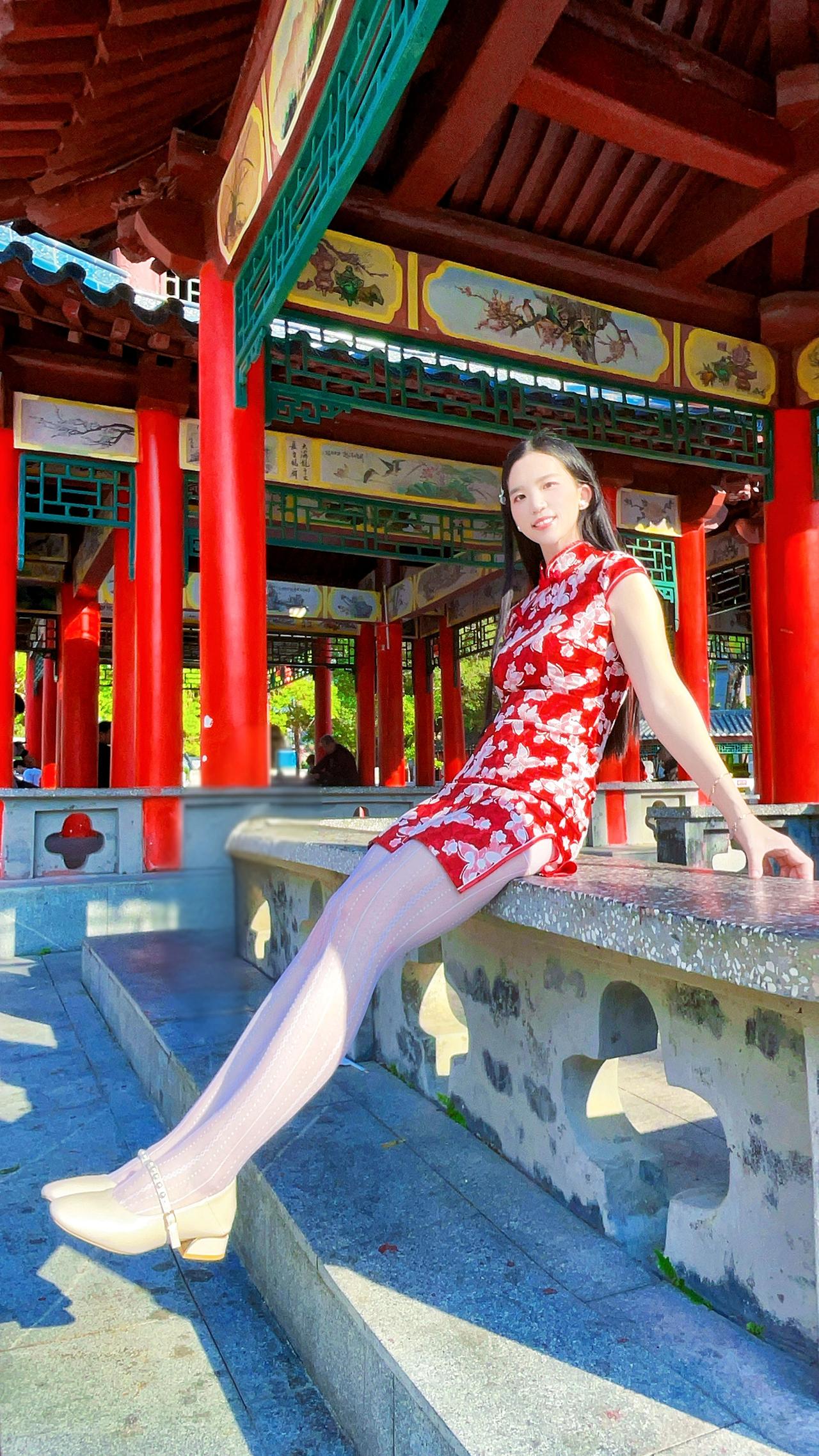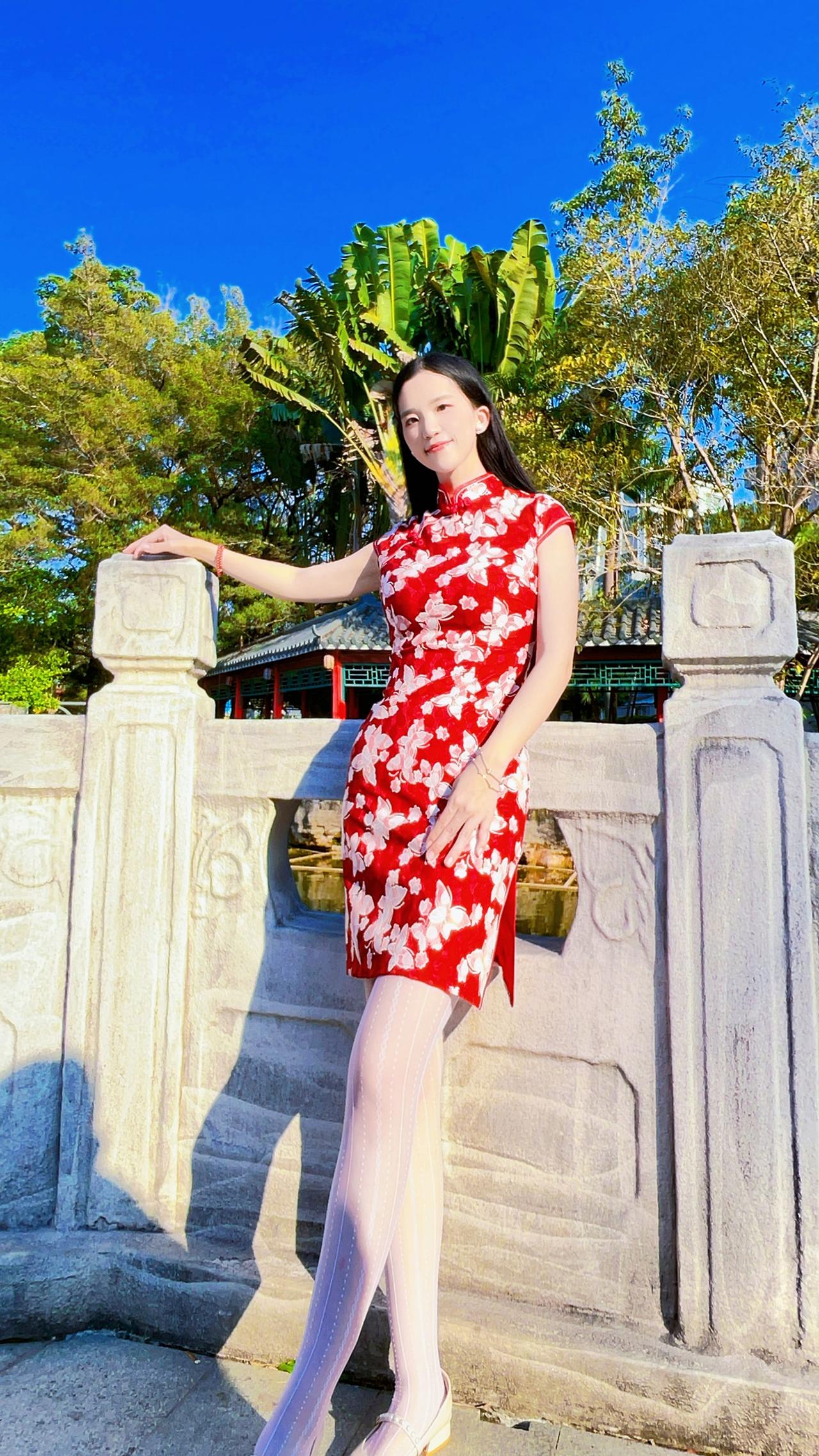 一袭碎花红旗袍,红底上点缀着细腻的花朵,仿佛将春日繁花穿在身上,既端庄典雅又透着灵动气息,尽显东方女性的温婉与风情。美女 旗袍 白丝袜 黑丝