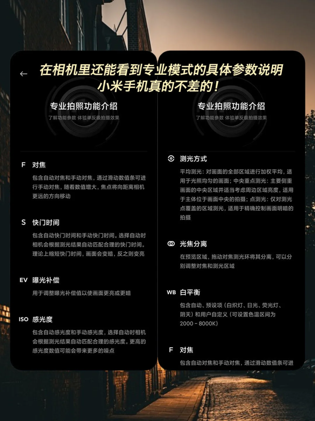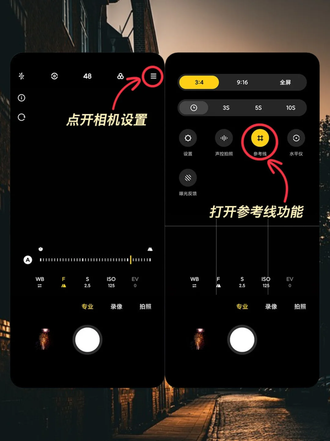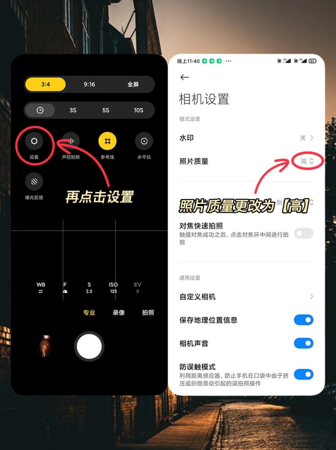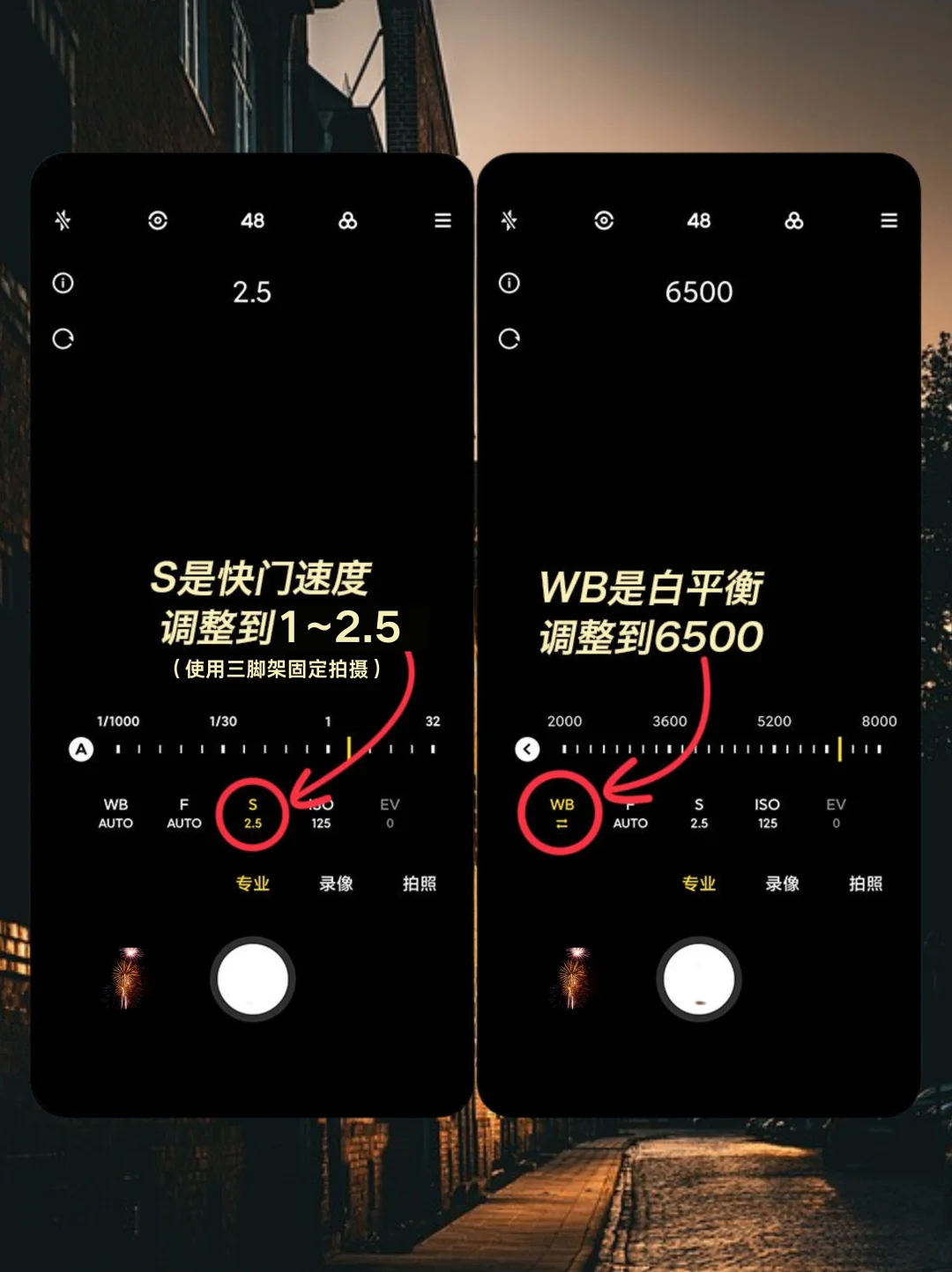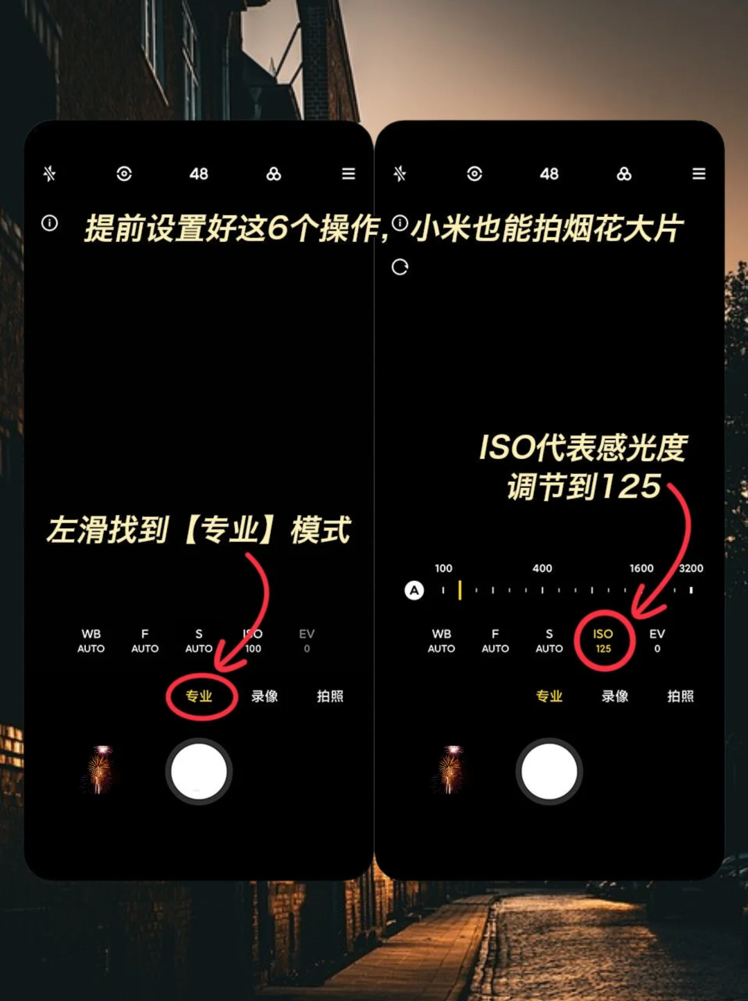 每年过年怎么少得了烟花呢?今天把小米红米相机的拍烟花模式告诉大家! 小米原相机杀疯了!过年这样拍烟花太绝了!每年过年怎么少得了烟花呢?今天把小米红米相机的拍烟花模式告诉大家! 小米和红米的姐妹们都可以试试! 1⃣️打开相机-专业模式 2⃣️参数调整 ISO:125 S:1/250 白平衡:5800 3⃣️根据当天烟花的天气和情况大家可以再自行微调!