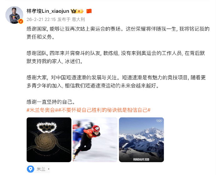 “感谢国家, 能够让我再次站上奥运会的赛场。这份荣耀将伴随我一生, 我将铭记我的责任和义务。