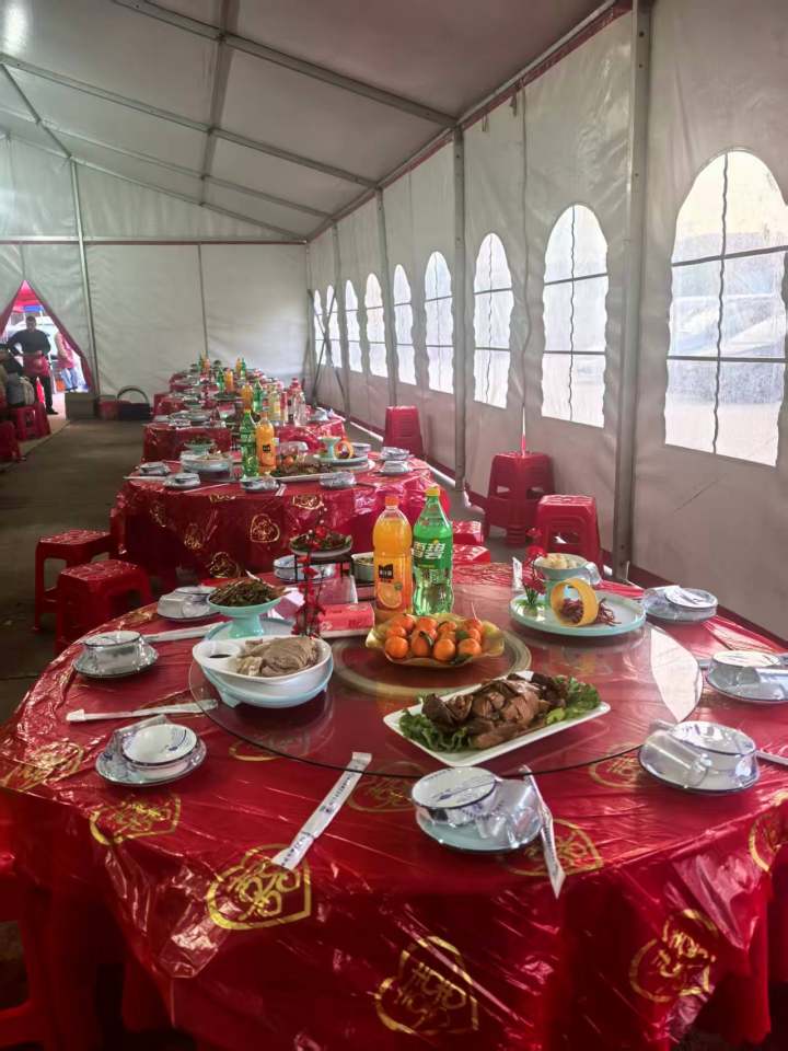 桂花马蹄、鲜炸腰果、柠檬凤爪、白切羊肉等六个凉菜,由几个村里的阿姨陆续送进来。在大棚外,厨师叶建华正和妻子忙碌地烧着下一道热菜。