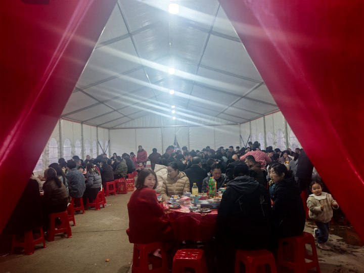 大棚内,二十二张圆桌分成三列次第摆开,桌上还摆着红艳艳的塑料梅花,喜气洋洋。村里另外人家也分别订了数量不同的拜年饭,大家互相用义乌话打着招呼。因为整个村大都是同姓,常常这家的亲戚跟另外一家也沾亲带故,于是互相又攀谈起来。一时间,大人谈话声、孩子笑闹声、再加上窗外的鞭炮声、鸡叫声,热闹得仿佛要把大棚掀翻。