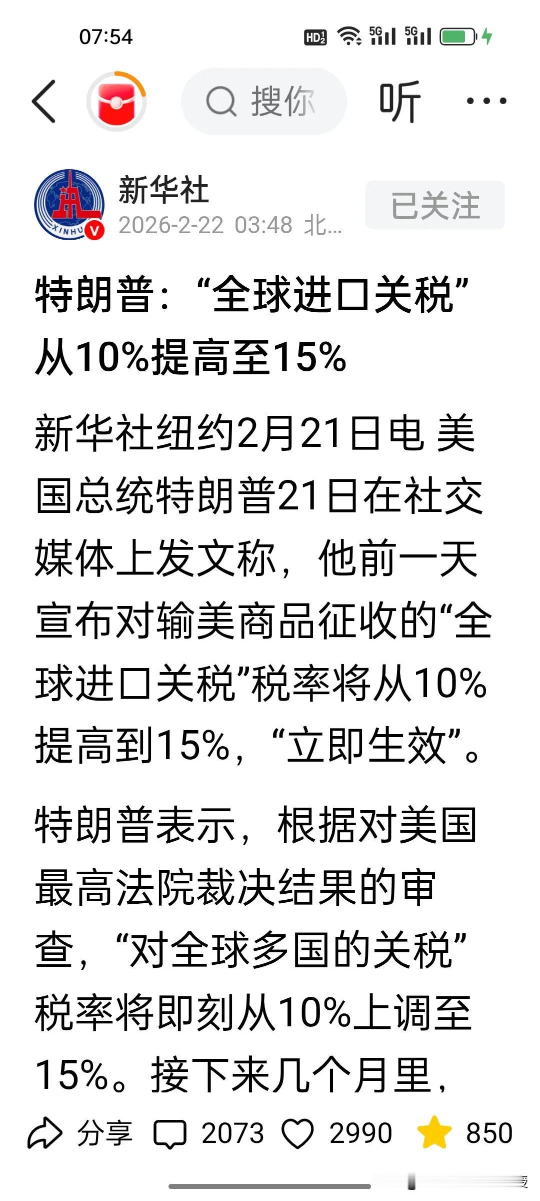 特朗普又突然把全球关税从10%拉到15%,葫芦里卖的什么药? 美国最高法院刚判他之前的关税“违法”,他转头就换了个法律依据,把全球进口关税从10%直接拉到15%,还“立即生效”。这波操作,表面是“补手续”,实则是在全球贸易桌上重新攥紧筹码。 1. 借最高法院裁决“转进”:最高法院说《国际紧急经济权力法》不能用来征关税,他立刻搬出《1974年贸易法》第122条,这个条款之前从未用过,允许他在贸易失衡时征最高15%的关税,相当于用新“尚方宝剑”继续搞贸易保护。 2. 为访华谈判加码:中方至今未官宣他访华,他就先在全球范围“秀肌肉”,用更高的关税作为谈判筹码,想在中美贸易谈判中占据更主动的位置。 3. 安抚国内选民:通过强硬的贸易政策,向支持者展示他“美国优先”的决心,为后续政治议程铺路。 至于15%关税落地的可能性,几乎是板上钉钉。毕竟他已经用新法律绕开了最高法院的限制,而且这个条款本身就允许他这么做。现在就看其他国家怎么接招,以及中美之间的博弈会走向何方了。 美国官员官宣访华一天了,中国到现在还没有官宣特朗普访华的消息,你觉得这次关税突然加码,会倒逼中方官宣访华吗?