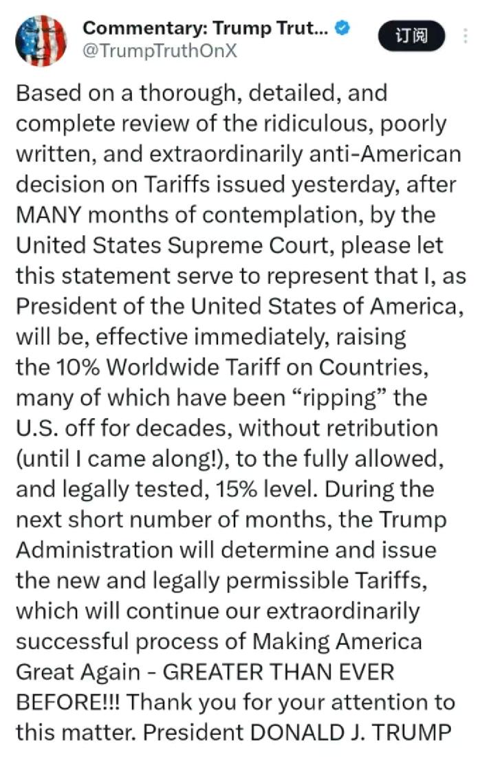 昨晚,特朗普写道:“基于对昨日美高院经数月深思熟虑后作出的荒谬、拙劣且极其反美的关税裁决的全面、详尽和完整的审查,谨此声明,作为总统,我将立即把对许多国家征收的10%关税提高到合法的15%水平。这些国家中一直在‘剥削’美国,却未受到任何惩罚,在未来数月里,我们将确定并颁布新的合法关税......” [机智]最高法刚判违法,特朗普反手加税:这不是强硬,是乱出牌!高院刚裁定旧关税违法,特朗普连夜换“法律马甲”,把10%全球关税直接抬到15%,典型的朝令夕改、以势压法。回顾历史,单边关税从来不是良药,上一轮贸易战已让美国通胀高企、企业成本暴增,如今强行加码,只会把压力转嫁给本国消费者与全球产业链。 这种边违法边加码的操作,把美式规则双标暴露无遗:对自己有利就用,不利就推翻。短期看是政治作秀,长期看严重冲击全球贸易秩序,盟友怨声载道,市场波动加剧。说到底,关税大棒解决不了结构性问题,只会让美国信誉与经济一起承压。