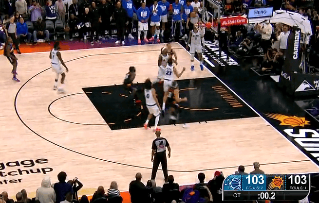 比赛的加时赛,马威空接极限出手偏出,太阳与魔术战平进入第二个加时。