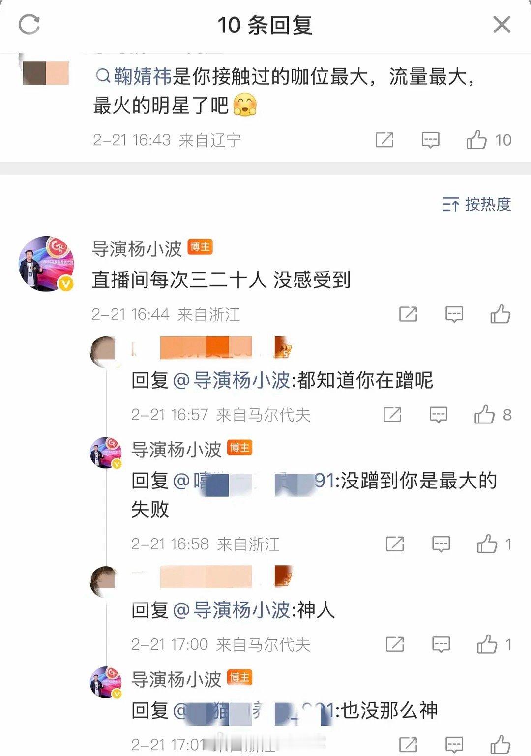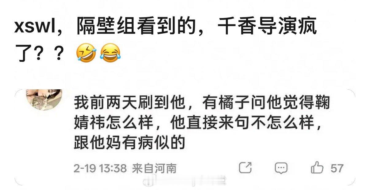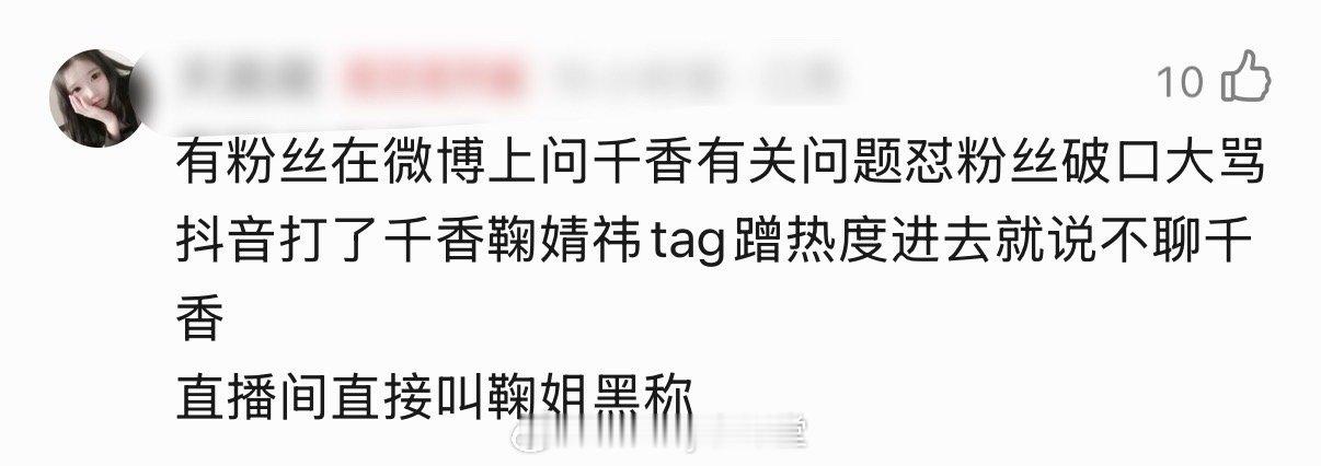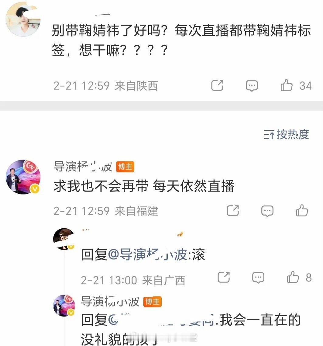 《千香》导演杨小波好像和鞠婧祎杠上了,直播带其他主演的名字,唯独没带鞠婧祎!粉丝问什么时候开播,他让粉丝去问问郭敬明,知不知道月鳞什么时候播?怎么会闹的这么难看