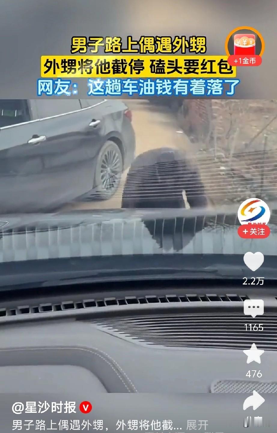 当舅舅的都躲出去了,没想到路上偶遇外甥,外甥倒车截停,开车下门,跪地磕头,一套动作行云流水。 外甥在车外笑出了猪声,舅舅在车内大笑不止,今天这红包,不包也得包了。