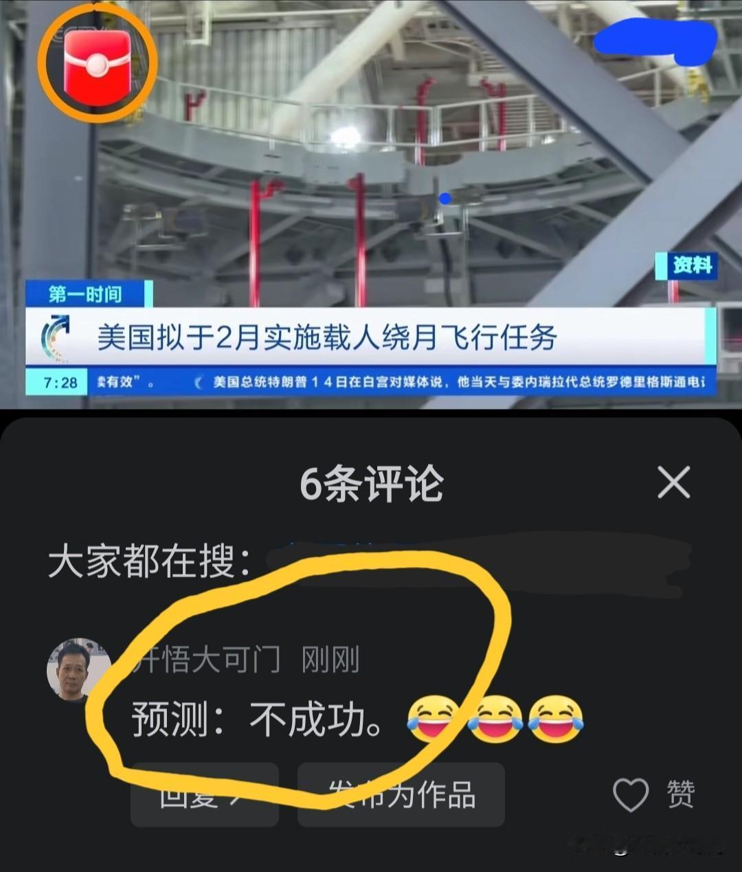 来看央视新闻:美国绕月飞行推迟。先前说的,没错吧? 因为杜门门迫(技术问题)。 (图片来自网络)