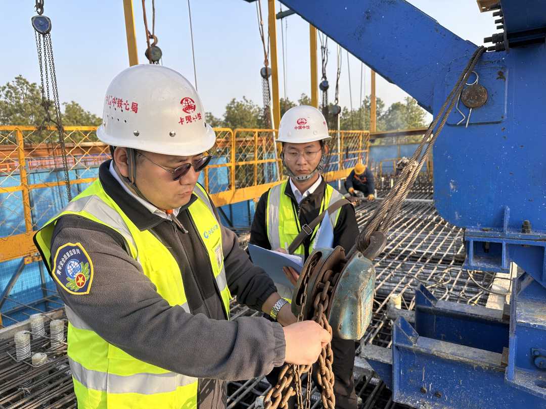 “此次挂篮走行施工的是合武高铁塘埠口滠水特大桥连续梁346号墩9号块,梁体下方是川龙大道,当前正值春节假期,车辆通行频密,在高达25米的高墩上进行锚固、前端封闭拆除、挂篮走行等工序,均需在高空、重载、交叉作业的条件下精准完成,哪怕只是一颗螺丝从梁体掉落,也可能给下方行车带来无法挽回的后果。正因如此,每一道工序都容不得半点马虎,每一名留守者都肩负着沉甸甸的责任。”工程建设管理方中国铁路武汉局集团有限公司武汉工程建设指挥部高级工程师孟春景介绍。