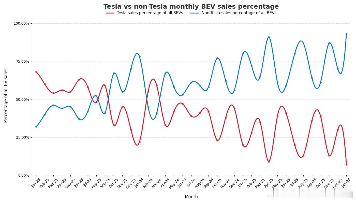 其中有一张很有意思的图,对比特斯拉和非特斯拉在澳洲整体电动车销量的比例变化,可以明显看到特斯拉在23年1月的市占率接近75%,而到了2026年1月只有6.8%,而来自中国的比亚迪、长城等都在不断扩大市场份额。