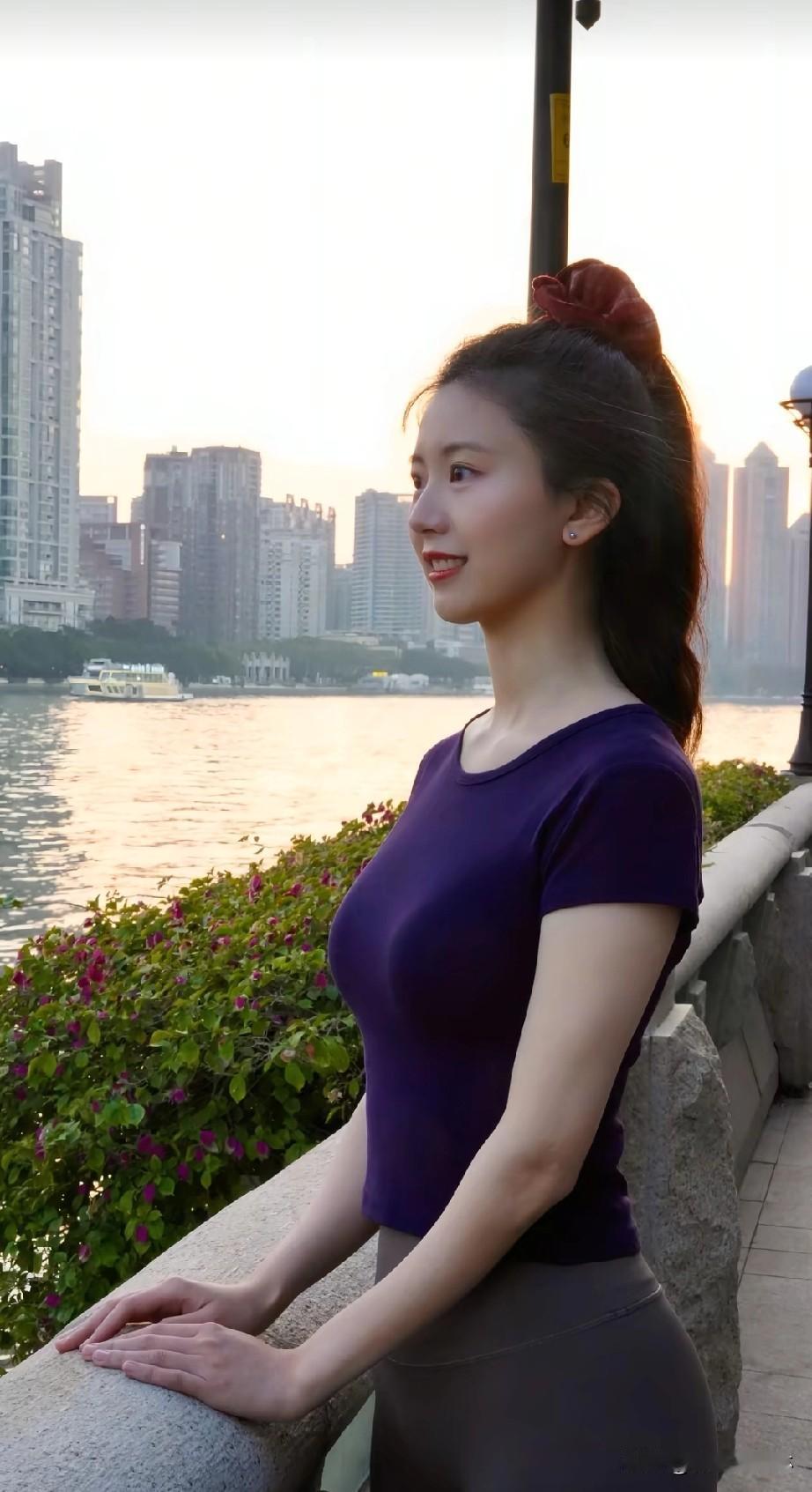 黄昏河畔,少女倚栏微笑,城市与自然交融的浪漫时光。