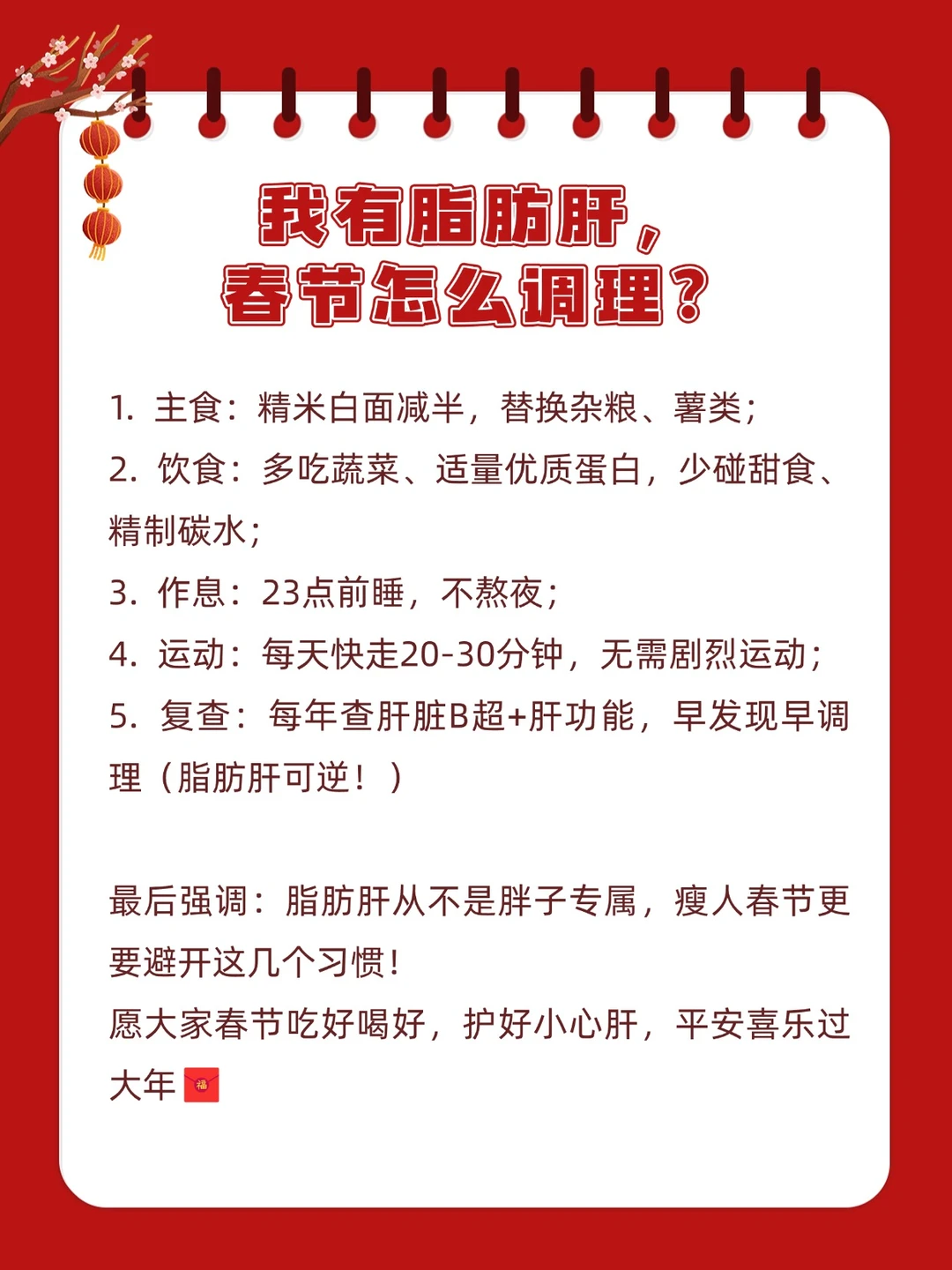 有脂肪肝,春节怎么调理? 1. 主食:精米白面减半,替换杂粮、薯类; 2. 饮食:多吃蔬菜、适量优质蛋白,少碰甜食、精制碳水; 3. 作息:23点前睡,不熬夜; 4. 运动:每天快走20-30分钟,无需剧烈运动; 5. 复查:每年查肝脏B超+肝功能,早发现早调理(脂肪肝可逆!)