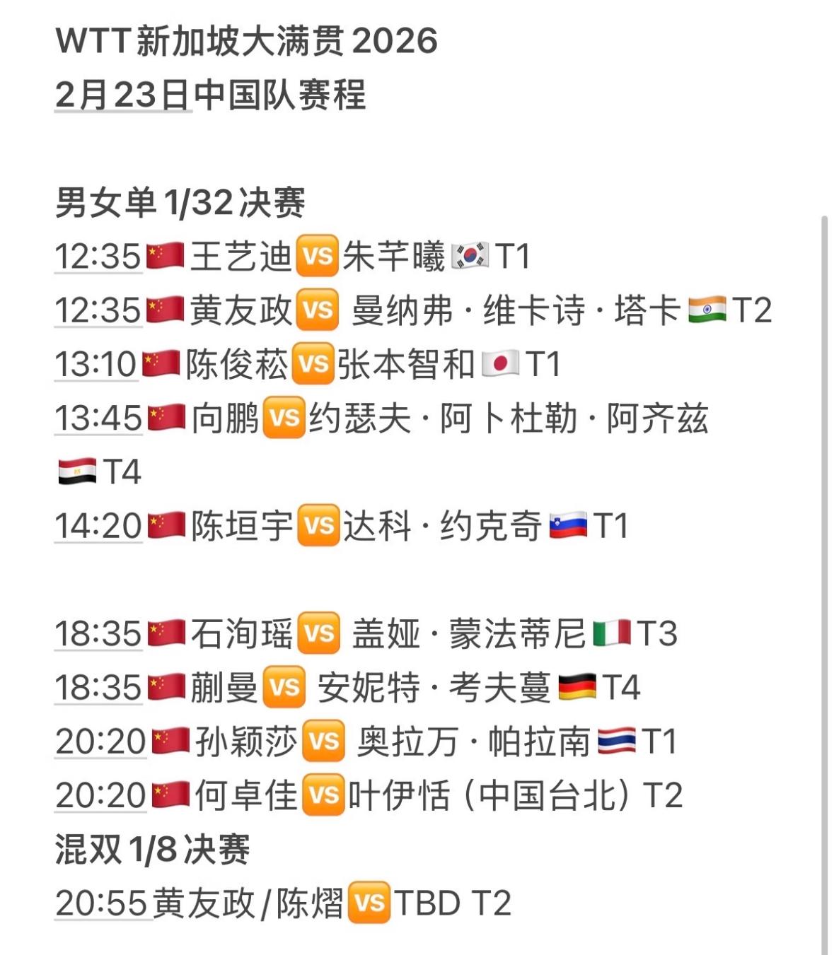 王楚钦与户上隼辅的头对头全记录—新加坡大满贯男单1/16对阵 王楚钦VS户上隼辅, 时间待定。 从以往的交手记录来看, 王楚钦保持对户上隼辅保持 6战皆胜的优势战绩, 最近一次交手是在2025年的 横滨冠军赛1/4决赛上, 当时王楚钦是4:1户上隼辅, 时隔近一年, 两个人再次在新加坡大满贯 相遇,王楚钦一定不要轻敌, 做好困难准备, 户上打德甲以后, 技术和速度都有提高, 王楚钦加油, 专注赛场每一分, 相信王楚钦必胜! 2月23日的赛程出炉, 国乒加油!
