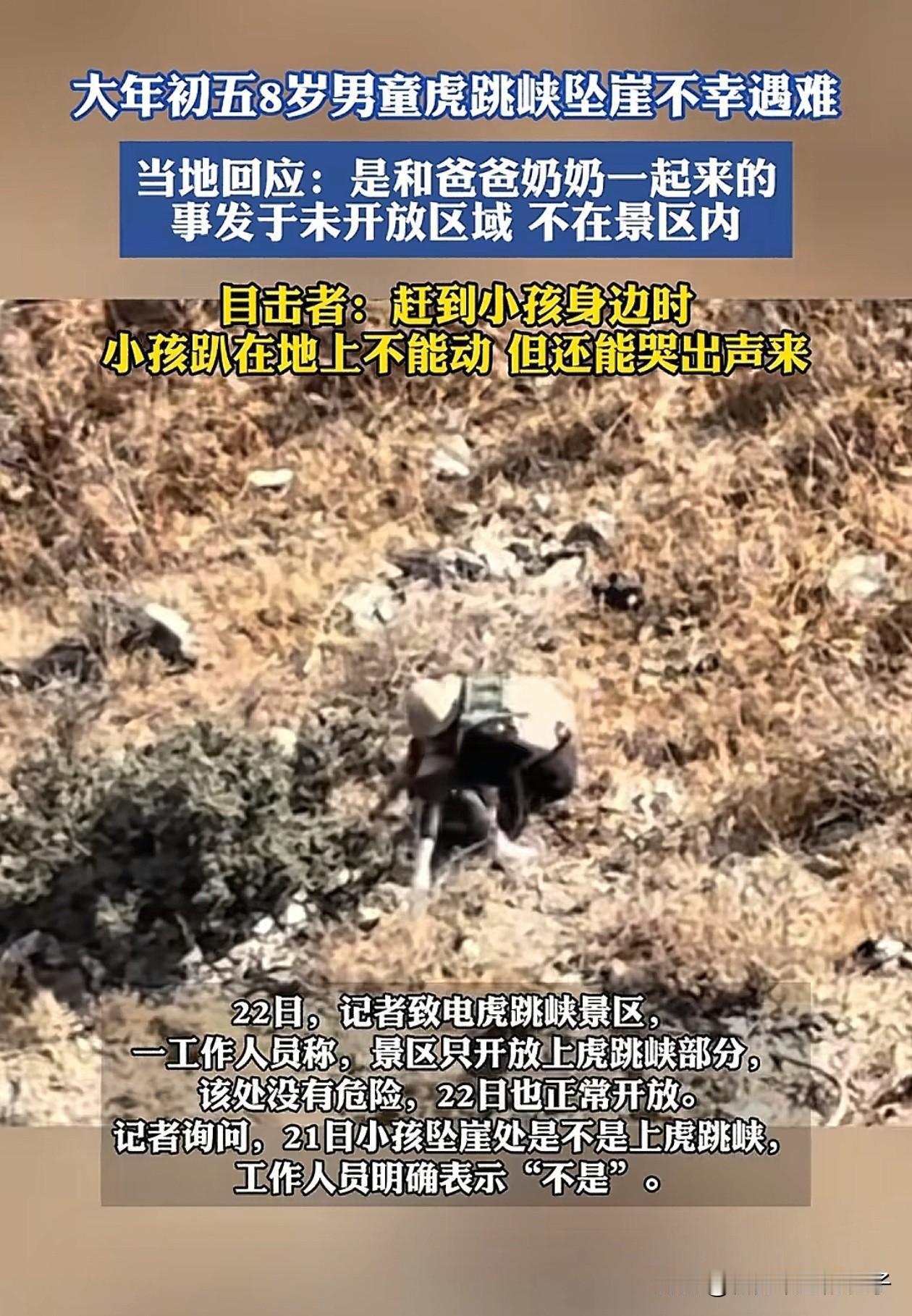 没有危险的时候,爸爸就是最大的危险,这话真的一点都没说错,云南虎跳峡8岁男童坠亡这事,越想越心痛,其实真不能怪景区提醒不到位,主要是孩子爸爸真的太自大了! 放着景区的安全路线不走,非要带着老人和8岁的孩子,去走早就封闭的小路,那条小路没有护栏,窄的地方就1米多,当天还刮着大风,又要照看老人,又要顾着小孩,必然会分心的。 最让人意难平的是,孩子摔下崖底后,本来还有微弱的哭声,还有最后一丝生机,结果这个父亲一点常识都没有,把孩子抱在怀里使劲摇晃。 这种外伤最好不去移动伤者,结果这个父亲自己把孩子最后的希望抹没了! 真的给所有家长提了一个醒,别拿无知当勇敢,别拿任性赌孩子的命,一时糊涂,就是一辈子的悔恨!