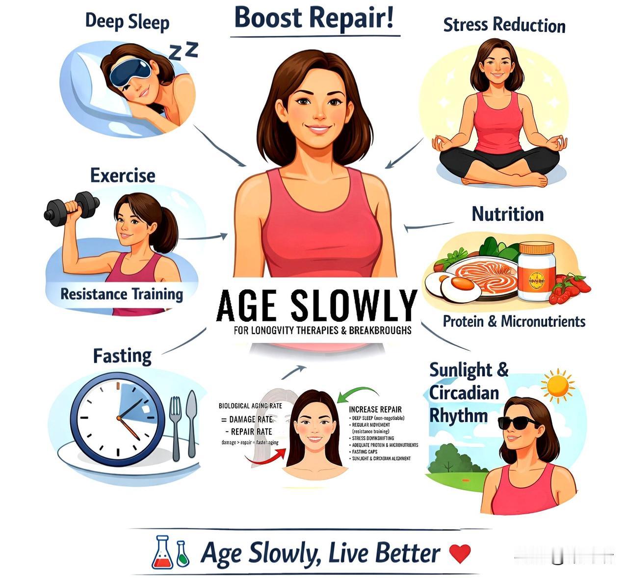 你的生理年龄不是固定的,它是可以商量的。 衰老不仅仅是时间的流逝,更是损伤的累积。 而你的日常习惯决定了这种损害累积的速度。 你可以延缓你的生物年龄 大多数“抗衰老秘诀”根本算不上秘诀。 这些行为人们早已熟知……但很少能坚持下去。 肌肉是长寿的保障。力量训练能够维持新陈代谢、激素平衡、大脑健康和独立生活能力。30岁以后,肌肉流失比皱纹更能加速衰老。 有氧运动可以提升你的细胞引擎。有氧健身可以改善线粒体功能、血液循环和大脑氧合作用。更高的最大摄氧量₂意味着几乎所有与年龄相关的疾病风险都会降低。 睡眠是大脑夜间保养的重要环节。深度睡眠可以清除代谢废物、稳定激素水平并减少炎症。长期睡眠不足会加速生物衰老。 血糖控制 = 延缓衰老。高胰岛素和内脏脂肪会加速细胞损伤。稳定的血糖水平能让你的身体内部系统保持更长时间的年轻状态。 真正的食物胜过“抗衰老”产品。纤维、微量营养素、omega-3 和充足的蛋白质支持修复你身体已有的系统。 慢性压力会从内部加速衰老。长期压力激素会损害免疫功能、大脑结构和细胞修复途径。 全天保持活动很重要,不仅仅是锻炼。即使是经常锻炼的人,久坐本身也会加速衰老。 坚持这样做,你不仅能活得更久,还能更长时间保持能力、思维敏捷和独立自主。 你的未来健康每天都在被塑造(或侵蚀)。 如果你能健康地步入老年,你将率先受益于即将推出的抗衰老疗法,从再生医学到长寿药物。 如果你的身体已经衰弱,那么在延长寿命方面取得的突破性进展也无济于事。 现在保持健康,为未来争取时间!
