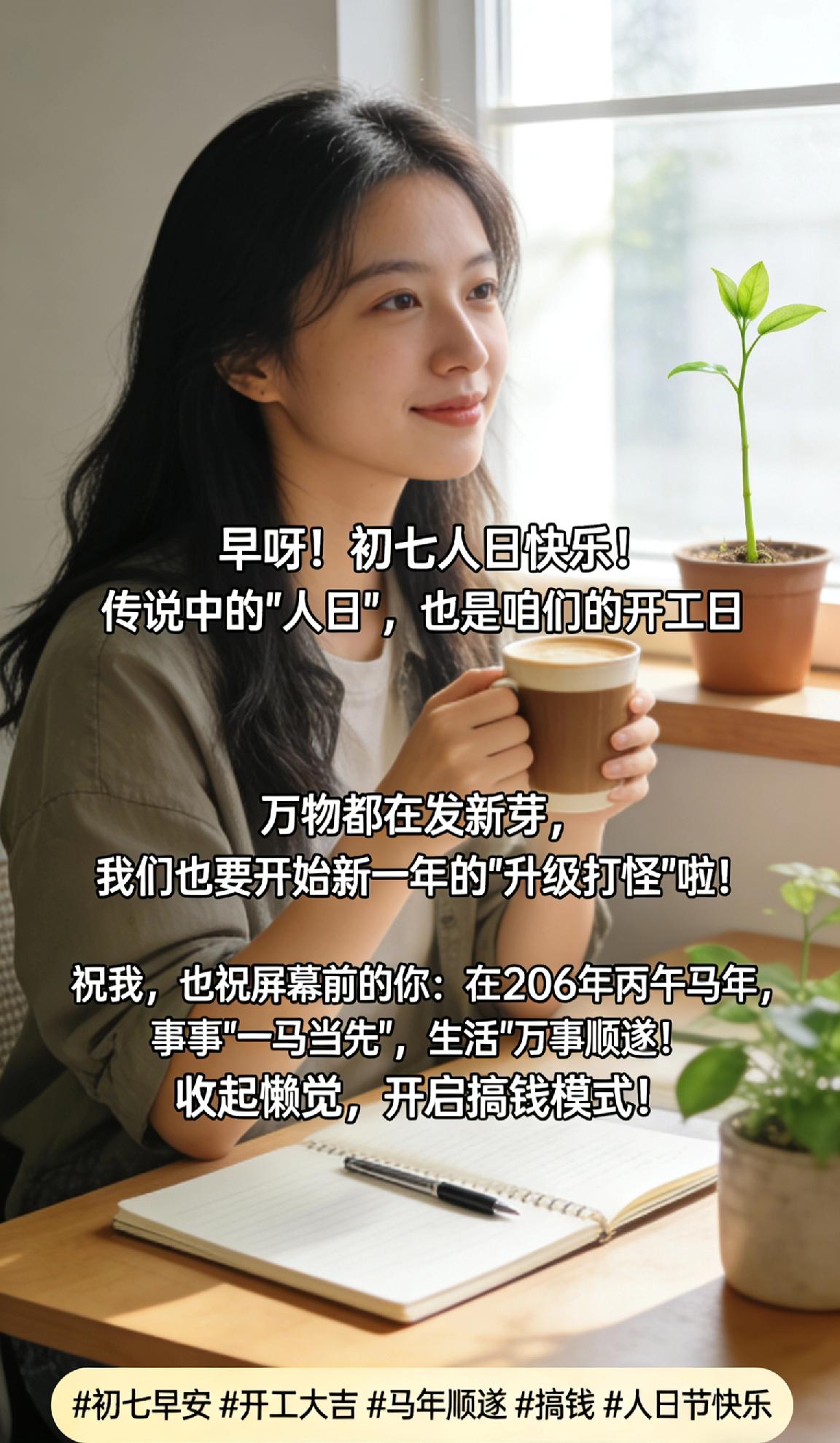 早呀!初七人日快乐! 🧨传说中的“人日”,也是咱们的开工日。 万物都在发新芽,我们也要开始新一年的“升级打怪”啦! 借用你的吉言: 祝我,也祝屏幕前的你: 在丙午马年,事事一马当先,生活万事顺遂! 收起懒觉,开启搞钱模式!💰💪 初七早安 开工大吉 马年顺遂 搞钱