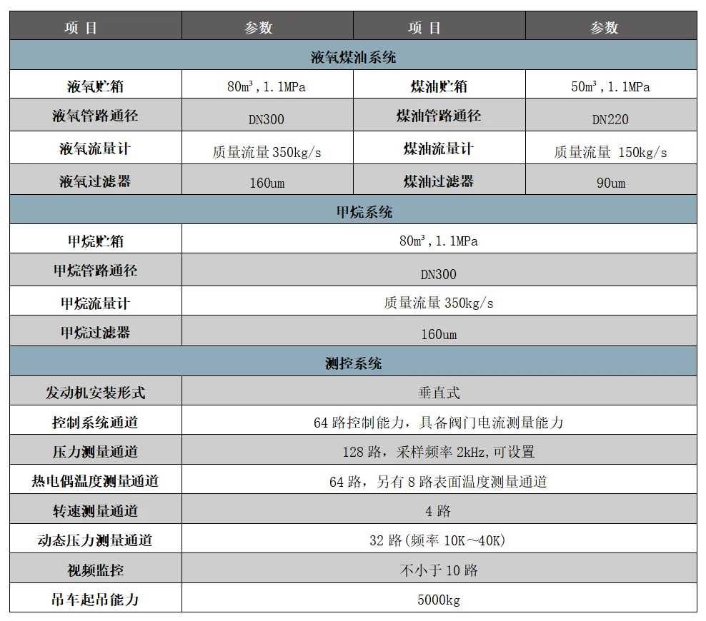 C-2试车台(二期)地面最大承载能力200吨级,初步计划于2027年启动建设,主要技术参数如表2所示。该试车台为双工位垂直试车台,能够进行200吨级液氧煤油和液氧甲烷发动机的整机点火。