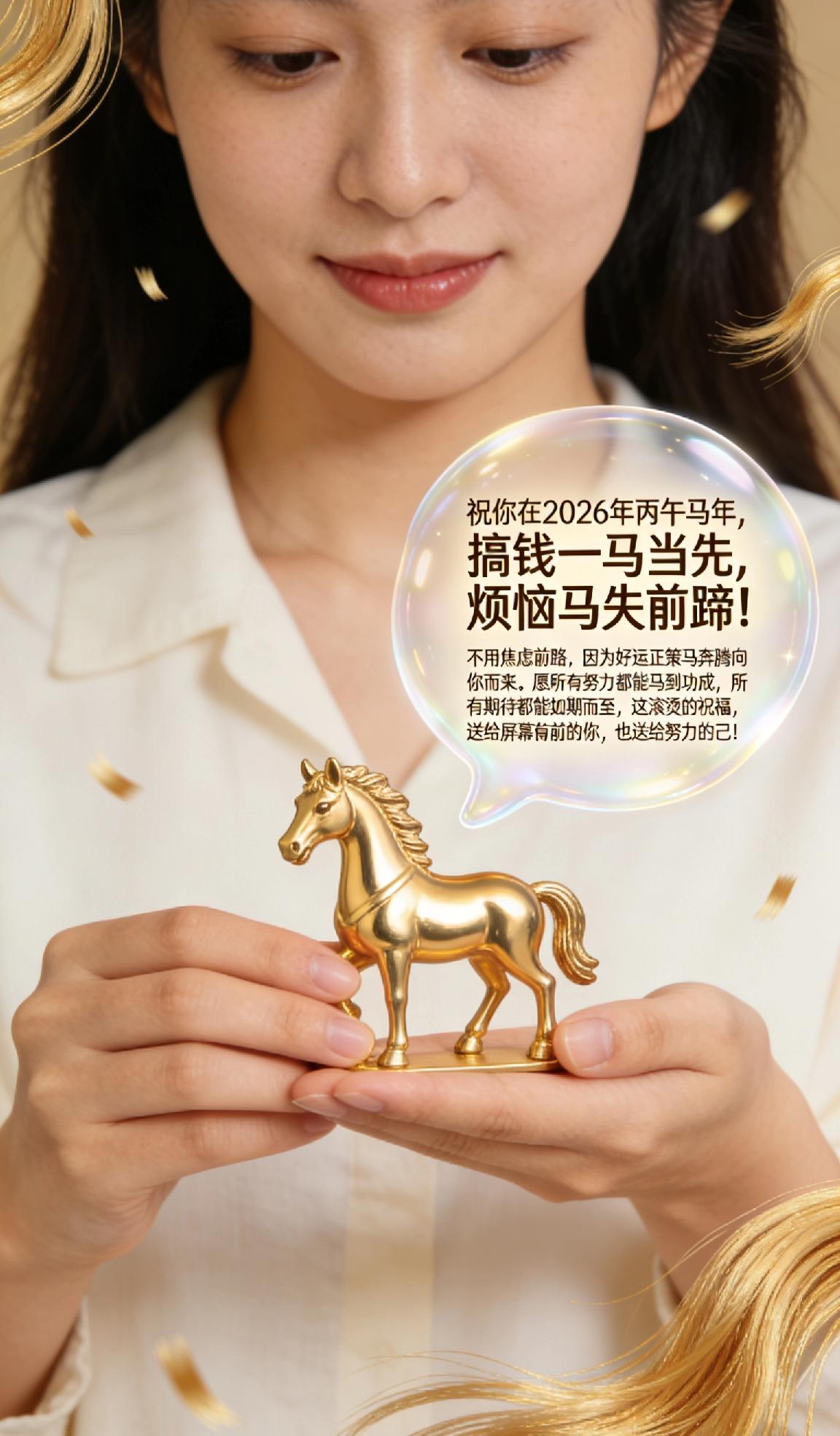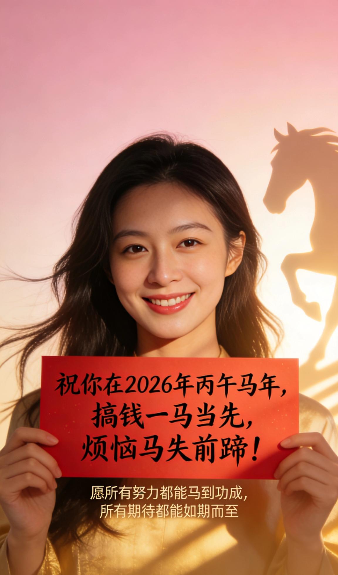 马年你最想听到的祝福是什么如果问我马年最想听到的祝福是什么?那一定是:“祝你在丙午马年,搞钱一马当先,烦恼马失前蹄!”不用焦虑前路,因为好运正策马奔腾向你而来。愿所有努力都能马到功成,所有期待都能如期而至,这滚烫的祝福,送给屏幕前的你,也送给努力的自己!马年你最想听到的祝福 马年大吉 一马当先 万事顺遂 新年心愿 暖心祝福