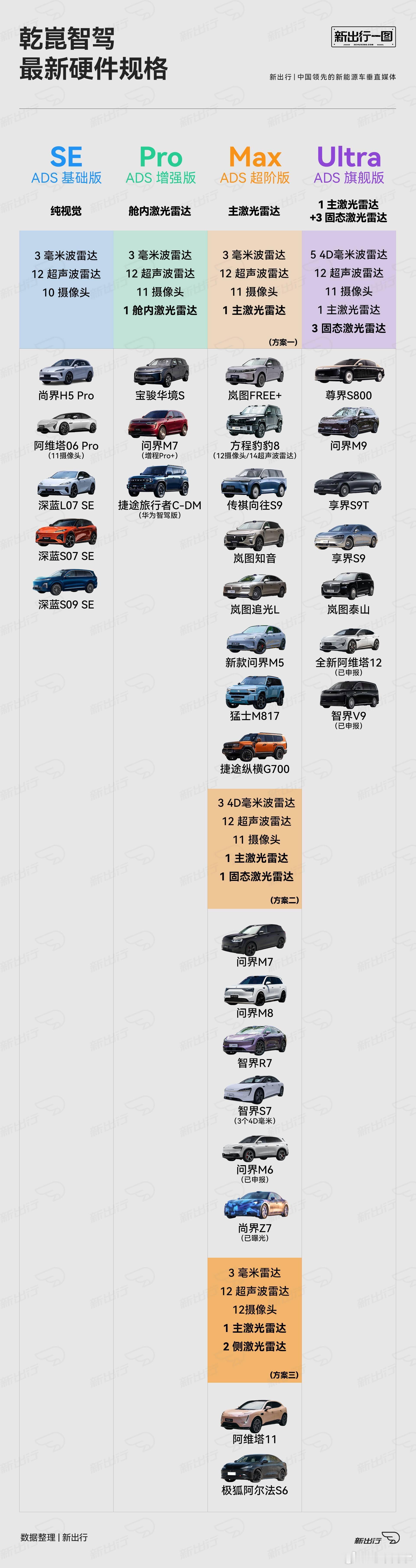 这个好,一图看懂乾崑智驾的硬件规格,和代表车型,尚界Z7和智界V9,一个MAX,一个Ultra
