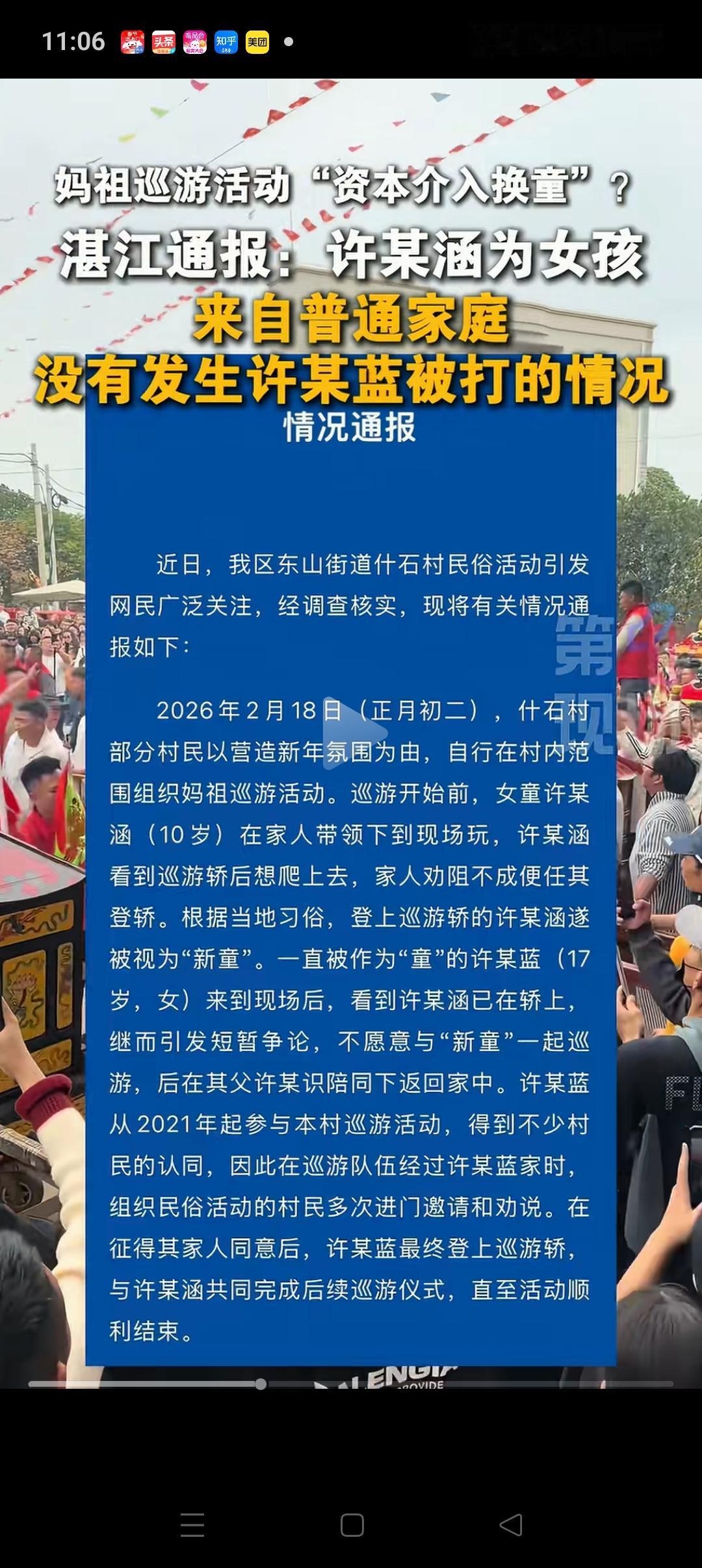 看了湛江妈祖巡游换神通的官方通报,有3点简直太凑巧了! 第一点:这个小女孩刚好穿了一套红色衣服,还缠了红纱巾,有点像特意准备的。不过在这么一个节日,好像也能理解,毕竟小朋友喜欢凑热闹。 第二点:正好等她准备登轿的时候,全村的村民却没有阻止。她的父母劝阻不成也没有极力拉回她。如果在我们这里,这么重大的节日,孩子不懂事,我们肯定会带回家的。 第三点:能够在这个节日,被选上登轿的孩子,都是之前已经商议好的,必须得到全部人的认可。但是这个小女孩没有掷圣杯的情况下,能够让大家信服,运气也挺好的