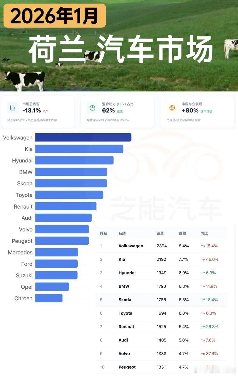 1 月荷兰车市整体下滑,受补贴退坡影响,前期需求被提前透支,市场明显降温。混动车型占比大幅领先,纯电份额回落,燃油车占比进一步压缩,小型车重新成为主流。