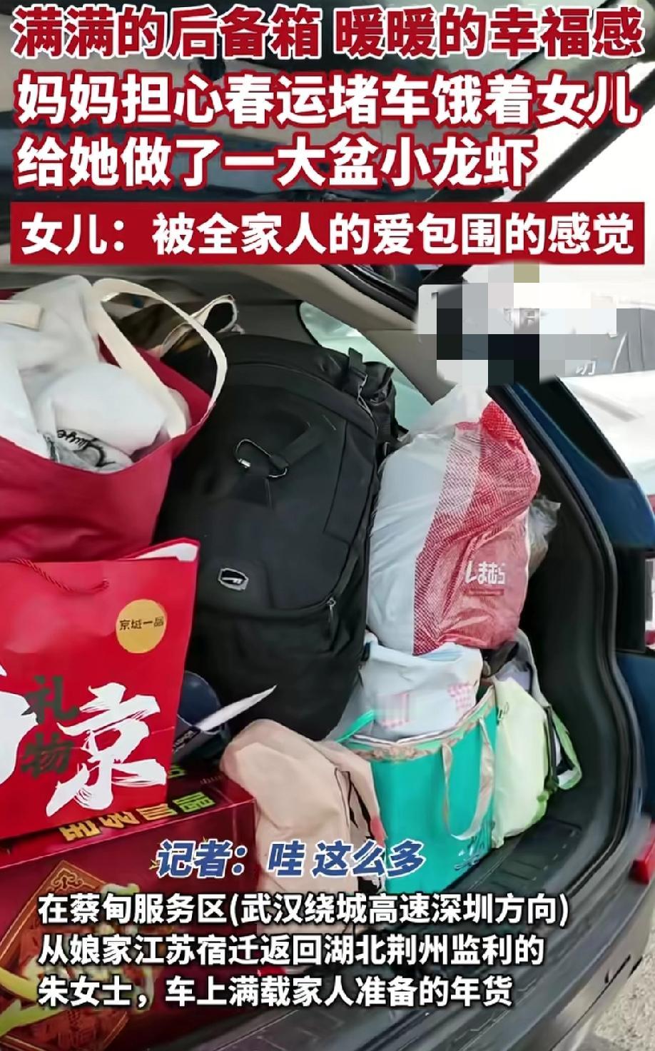 过年回家,你的后备箱被装满了吗? 娘家在江苏的朱女士返程回湖北,后备箱里被家人塞的满满当当,除了一些家乡的特产外,最贴心的还是妈妈,她怕女儿路上堵车,提前给女儿准备了小龙虾,烙饼,酸菜,生怕饿着女儿。 朱女士表示,被家人的爱包围的感觉很幸福、很贴心,相信这熟悉的一幕是无数游子离家前都曾经历过的,不管你在外面过的有多好,在父母心里就怕你饿着、冻着,不舍得让你受一点罪。