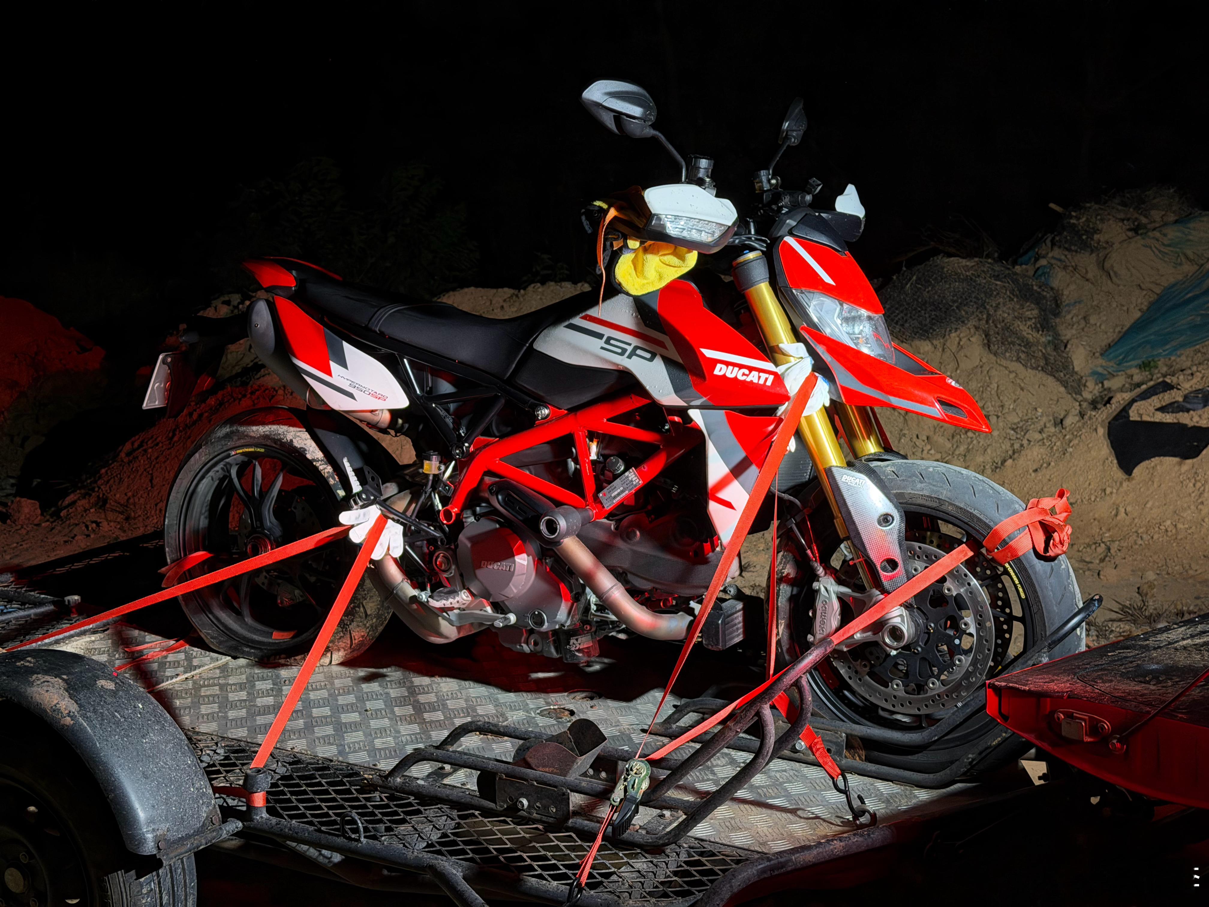 我和老王大概 22:00 借到了板车,23:00 到的山里。老王工具很齐,绑车带啥的都有,但也两人都是第一次绑摩托,折腾了 50 分钟,到五指山摩咖驿站已经凌晨 1 点了。