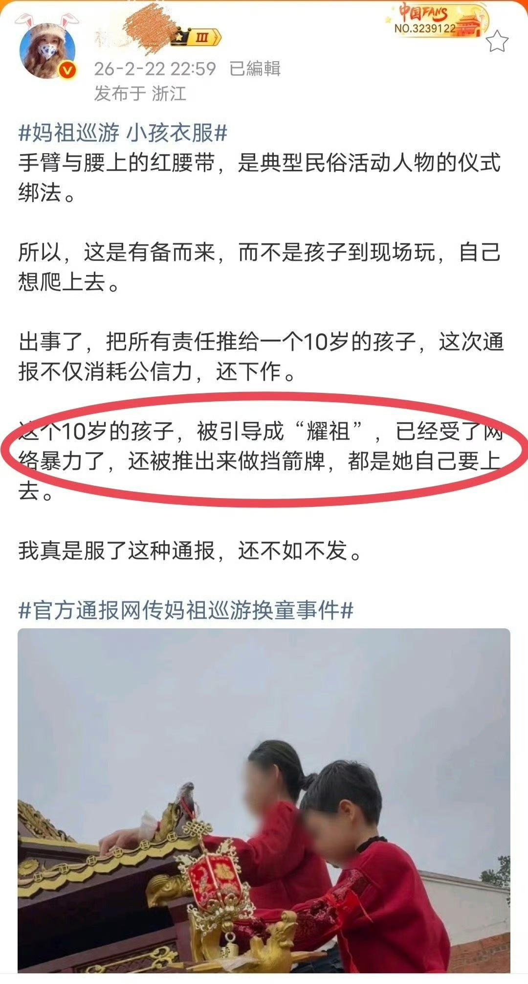 说白了,这件事最恶劣危害最大的地方,就是把女新乩童造谣成男童,然后女权带节奏狂骂国男。 这也是最容易拆穿的谣言,其他的那些过程,还有点各说各话的空间。但这位新乩童是男是女这件事,非常客观,毫无狡辩余地。 看看这个大V在官方通报发布前后的两套嘴脸,明明是她自己带节奏,事后又装做无辜的样子痛批带节奏的人。 老乩童现在也起号成功成大网红了,怎么就是不敢正面回应一下,新乩童究竟是男是女?