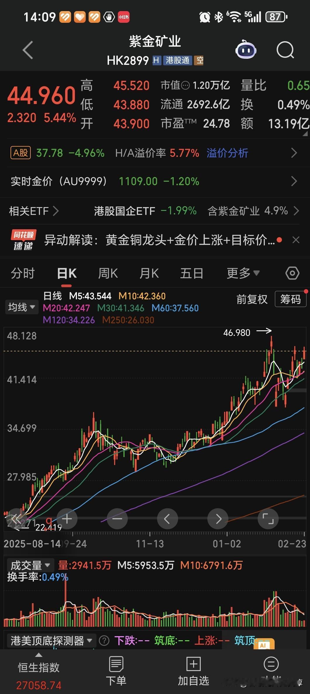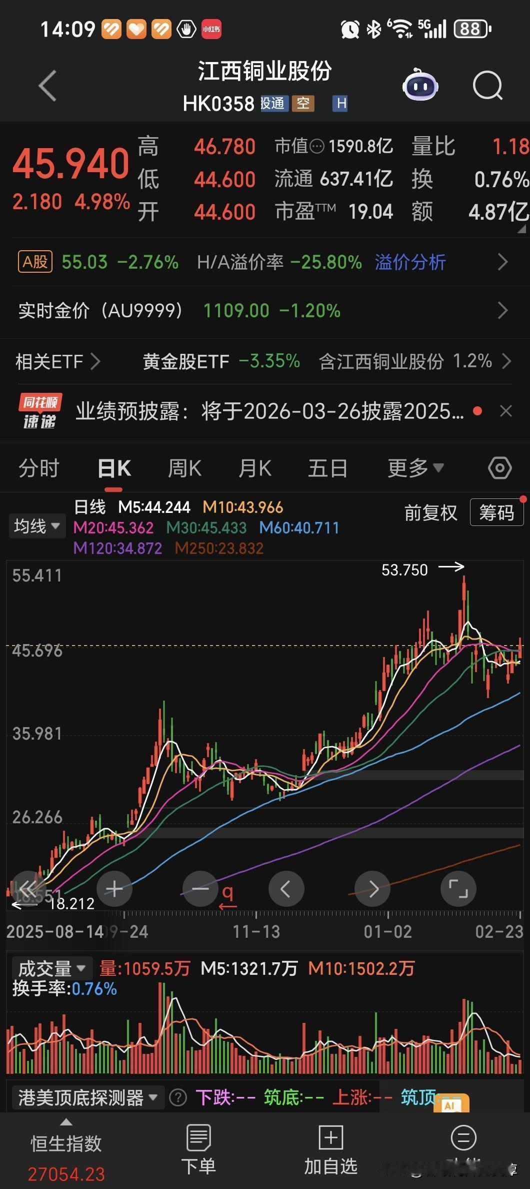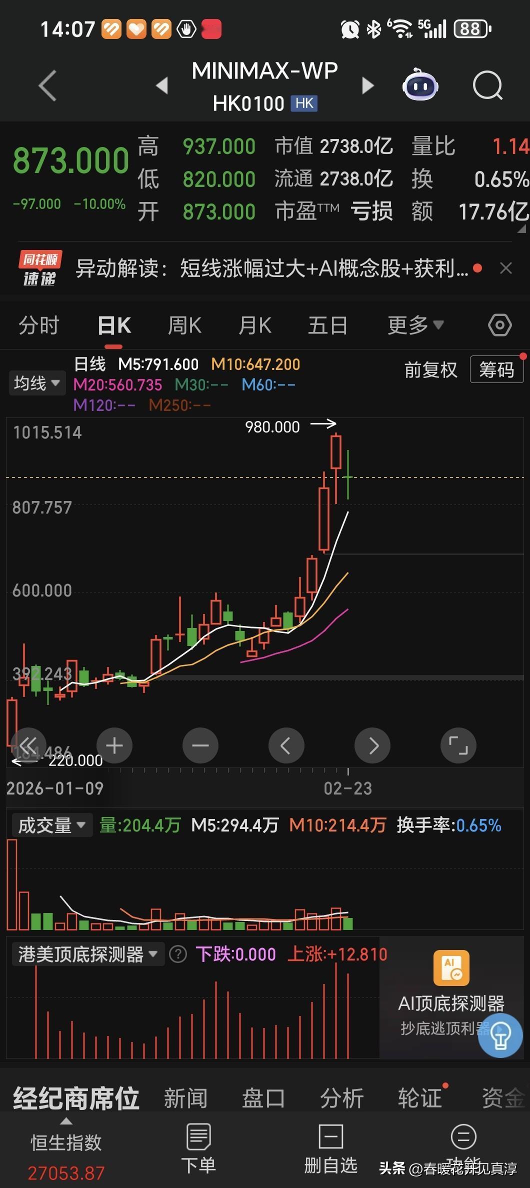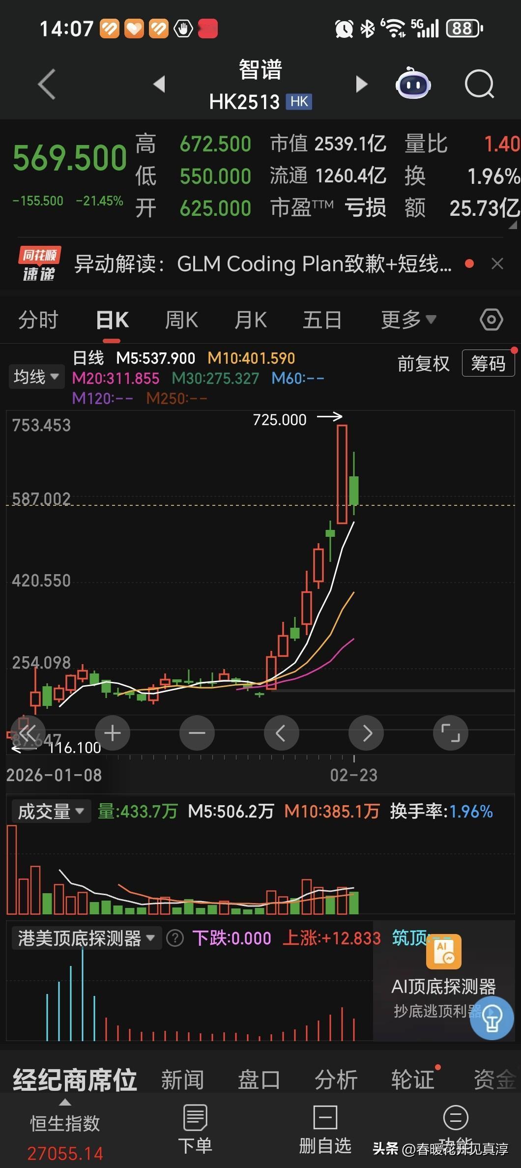 明天是马年第一个交易日,我们看一下当前的先行指标。首先,黄金又回到了5100美元上方,伦敦铜、纽约铜等也保持了平稳。 港股江西铜业、紫金矿业高位红盘,中信证券也没有出现大的波动,这说明基本盘还是比较稳的。 富时中国50指数今天是两个多点的涨幅,这说明人心思涨,气氛保持的不错。 春节期间大涨的大模型股票智谱和minimax,今年出现了大幅下跌,说明春节期间对人工智能的炒作热度已经逐渐在冷却。 今天是春节假期的最后一天,我相信很多朋友已经收心,准备上班和开盘。很多节前持币过节的朋友,估计又要买回原来的仓位,所以明天大概率会是一个红盘。 总体来说,春节期间无晴也无雨,又要回来战斗了,朋友们! 预祝朋友们丙午马年,市值一马当先,早日财富自由[啤酒]