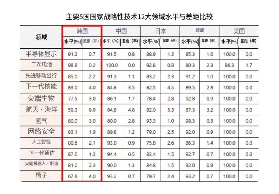 韩国智库公布的科技水平评估结果挺有意思。从2014年到2024年这11年,变化可大了。2014年中国落后美国5.8年,如今只落后2.1年,还追平日本、超过韩国0.7年,妥妥是增长最快的。 就拿二次电池领域来说,2022年韩国还领先中国0.9年,到2024年中国就跃居第一,韩国反倒落后0.2年。中国的宁德时代、比亚迪等企业在能量密度成本、磷酸铁锂技术与专利上全球领先,把韩国LG、三星SDI份额都挤下去了。韩国现在也就高端半导体还有点优势。不得不说,中国科技发展太猛啦!