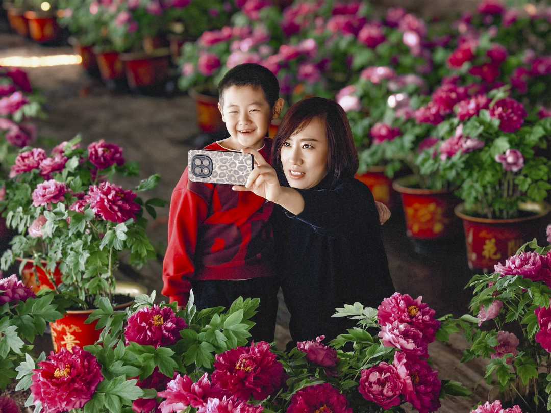 2月22日,游客在山东省菏泽市诚美牡丹产业园观赏盛放的牡丹花。春节期间,年宵花热销,“美丽经济”不断升温。