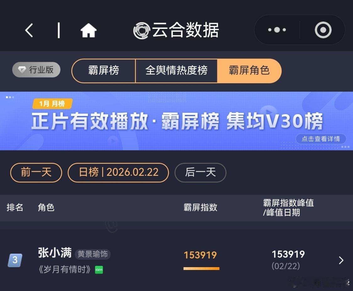 2月22日,黄景瑜岁月有情时 开播第3天,云合第3,霸屏榜黄景瑜张小满 第3,酷