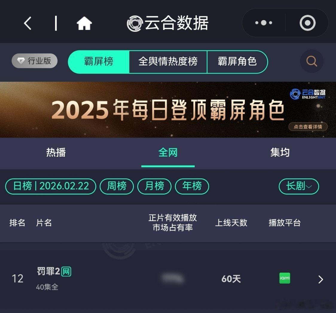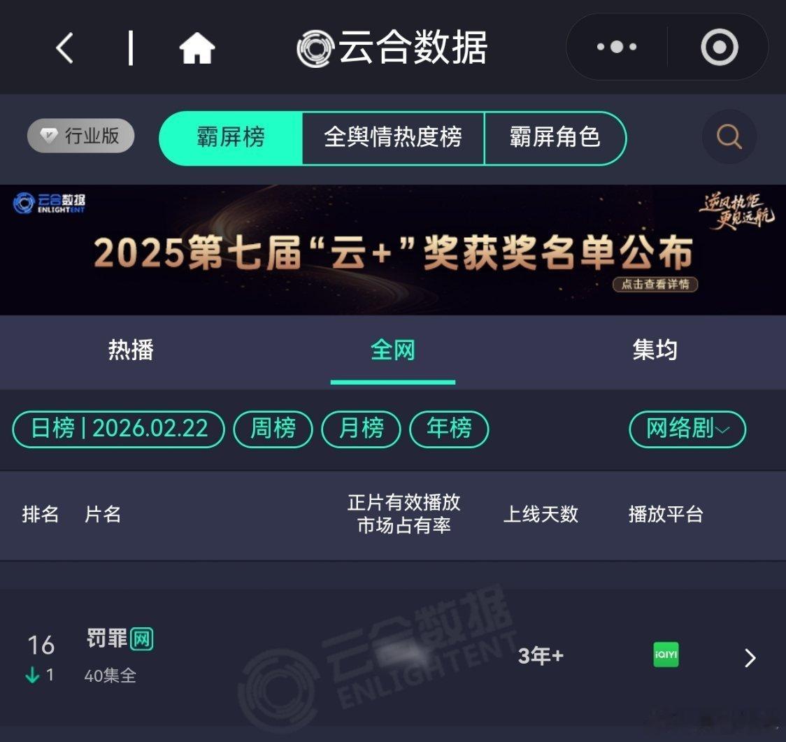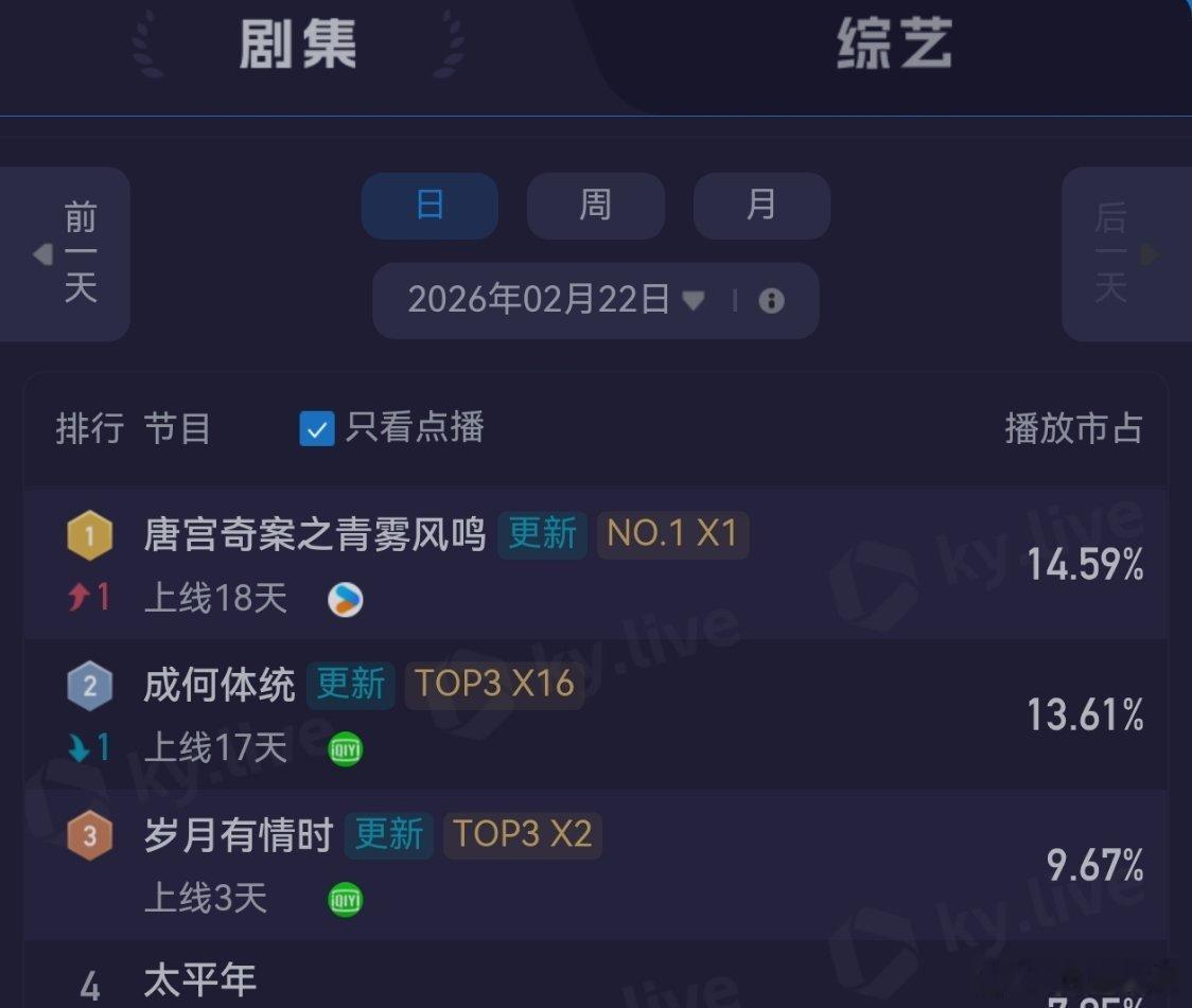 2月22日,黄景瑜岁月有情时 开播第3天,云合第3,霸屏榜黄景瑜张小满 第3,酷云点播第3。黄景瑜罚罪2 云合热播期结束第8天,上线第60天,全网第12。黄景瑜秦枫 ,罚罪,网络剧榜第16。