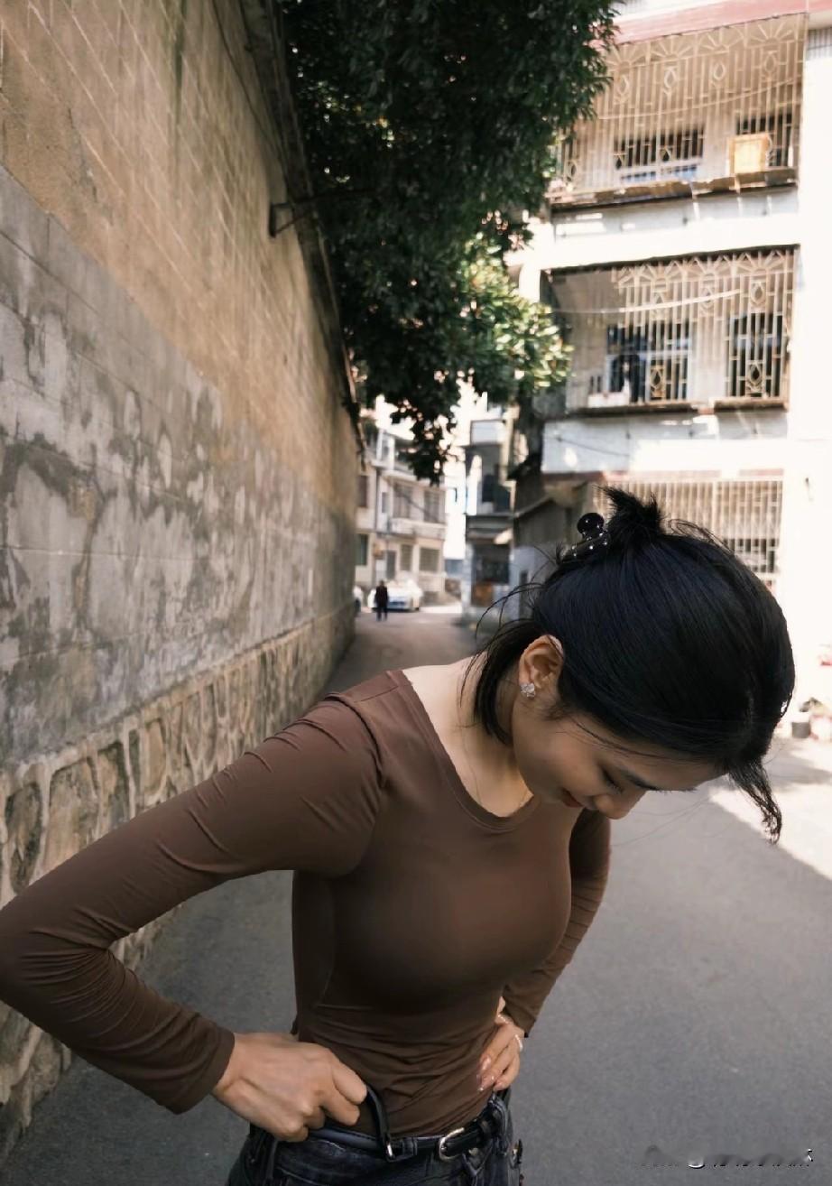 都市女孩的复古街拍,棕色上衣与石墙的完美搭配