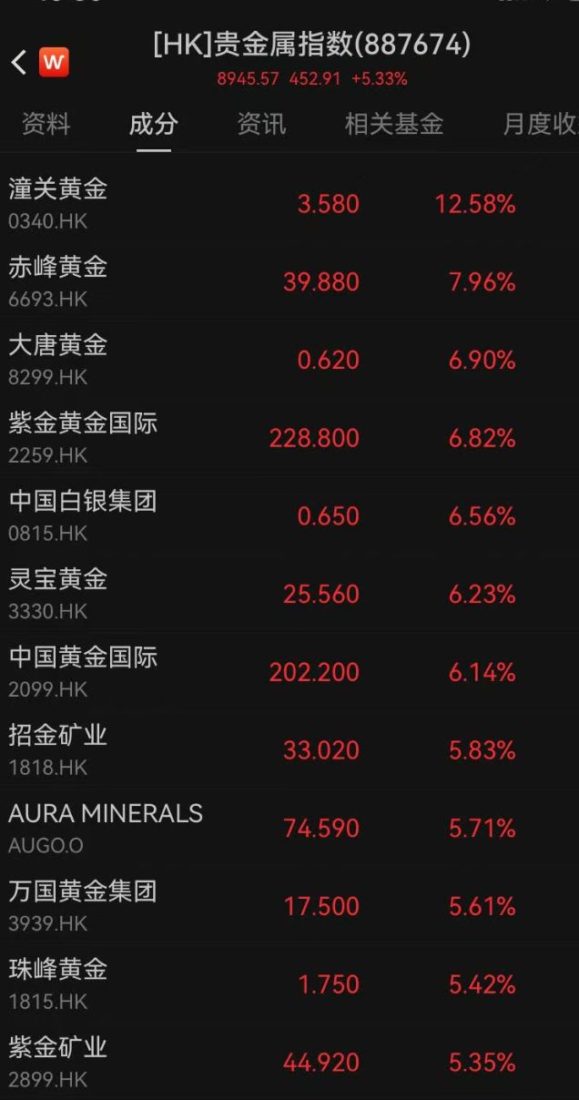 黄金股普涨,潼关黄金涨12.58%,赤峰黄金涨7.96%,紫金黄金国际涨6.82%,灵宝黄金涨6.23%,中国黄金国际涨6.14%,招金矿业涨5.83%,紫金矿业涨5.35%,山东黄金涨4.60%。
